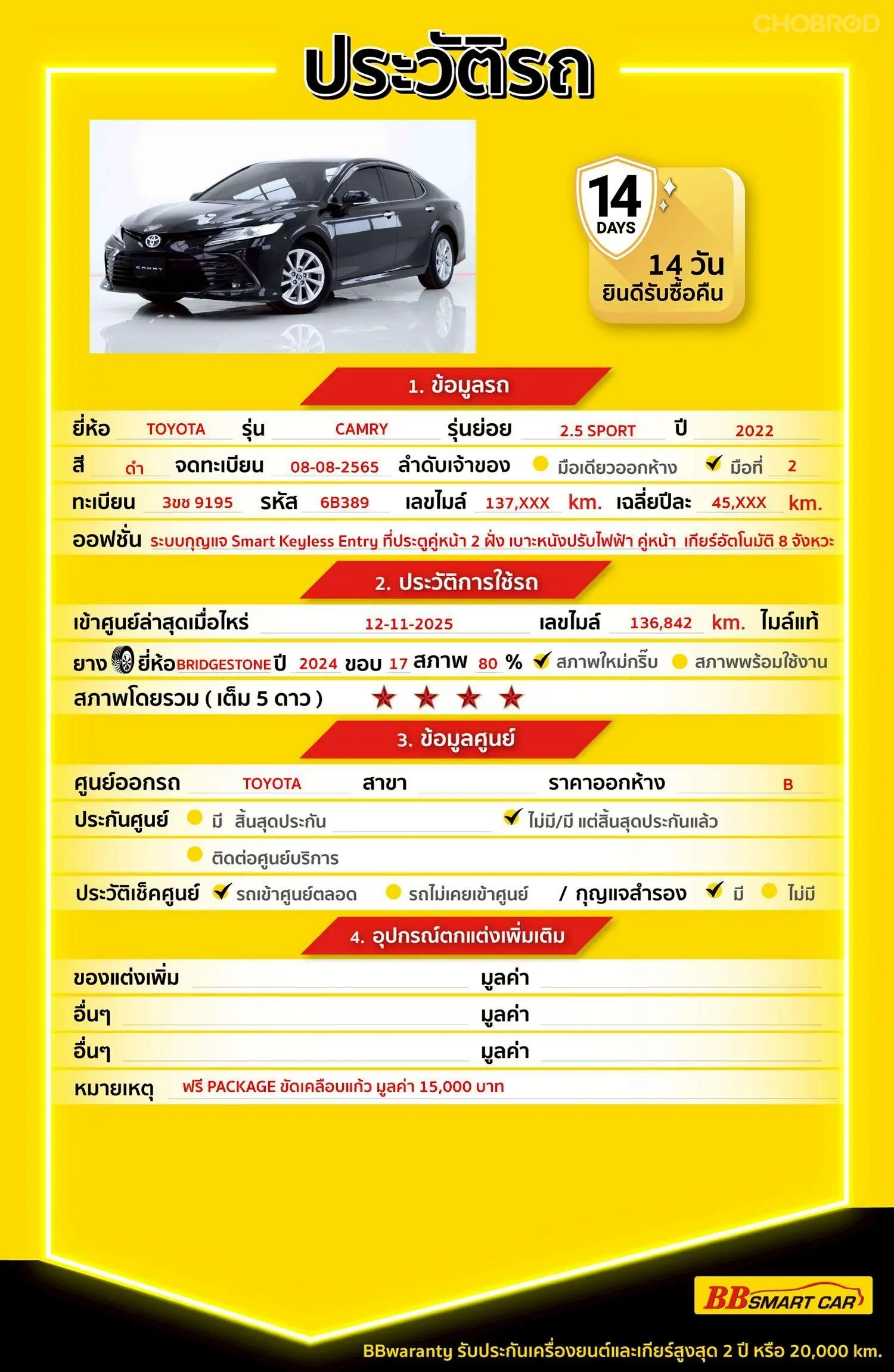 TOYOTA CAMRY 2.5 SPORT AT 2022 ออกรถ 0 บาท จัดได้ 769,000 บ. Line:@*******แสดงข้อมูล 🔥จอง 199 บาท ส่งบัตรประชาชน รู้ผลพิจารณาภายใน 30 นาที ไม่ผ่านคืนเงินจองทุกกรณี 🔥ซื้อรถกับ BB พร้อมให้คำปรึกษา แก้ทุกปัญหา ให้ทุกเรื่อง บริการ call center 24 ชม. 🔥BB Care Plus รับประกันหลังการขาย สูงสุด 2 ปี หรือ 20,000 km.. 🔥มีรถให้เลือกมากกว่า 1,800 คัน สาขา 6 ศูนย์รวมรถยนต์ไอคาร์สยาม กาญจนาภิเษก รหัสรถ 6B389 ราคา 749,000 บาท ผ่อนเพียง 12,707 บาท Brand. : TOYOTA Year. : 2022 Model. : CAMRY Grade. : 2.5 SPORT Engine. : 2,500 CC Type. : เบนซิน Gearbox : AT Color. : ดำ Mileage. : 137,xxx KM. (ซื้อสด ราคานี้ยังไม่รวมค่าดำเนินการ 10,000 บ.) 🚩 Price. 749,000 บาท ยอดจัด : 759,000 บาท เงินดาวน์ : 0 บาท ประกันภัย : ฟรีประกันภัย 1 ปี ค่าดำเนินการ : 10,000 บาท รวมออกรถ : 0 บาท ผ่อน 36 = 24,447 บาท ผ่อน 48 = 18,807 บาท ผ่อน 60 = 15,626 บาท ผ่อน 72 = 13,980 บาท ผ่อน 84 = 12,707 บาท เงื่อนไขเป็นไปตามที่ไฟแนนซ์กำหนด โปรโมชั่นพิเศษ สำหรับลูกค้าเครดิตดี 🚩เลือกรับเรทดอกเบี้ยพิเศษ 📍36 งวด = 1.29 % 📍48 งวด = 1.99 % 📍60 งวด = 2.39 % 📍72 งวด = 3.59 % 🔥 เงื่อนไข โปรโมชั่น ดอกเบี้ยเริ่มต้น 1.29% ตลอดอายุสัญญา - ยอดจัดไฟแนนซ์ 300,000-600,0000 บาท - ผ่อนสูงสุด 72 เดือน - เป็นลูกค้าประวัติดี พนักงานประจำเงินเดือน 20,000 ขึ้นไป - ค่าดำเนินการแคมเปญ 20,000 บาท (รวมในยอดจัดได้) 🎗Car Hightlight รถสวยๆ วันนี้ขอแนะนำTOYOTA CAMRY 2.5 SPORT AT 2022 ออฟชั่น 12.2.1 : ไฟ Daytime Running Lights แบบ LED 3 Strips 12.2.2 : ระบบกุญแจ Smart Keyless Entry ที่ประตูคู่หน้า 2 ฝั่ง 12.2.3 : เบาะหนังปรับไฟฟ้า คู่หน้า 🎗ภายใน พวงมาลัยเพาเวอร์ จอ LCD เล่น DVD เบาะไฟฟ้าคู่หน้า เบรค ABS Airbag พวงมาลัย Multifunction แอร์ AUTO กระจกไฟฟ้า กระจกมองข้างปรับไฟฟ้า เซ็นทรัลล๊อก 🎗ภายนอก Cruise Control คิ้วกันสาด ล้อแม็ก ไฟตัดหมอก 🎗ความคุ้มค่า สำหรับคันนี้หากเปรียบเทียบราคากับคุณภาพ คันนี้ถือว่าคุ้มค่ามากค่ะ ผ่อนสบายๆก็มีรถขับได้ รถดีมีคุณภาพแบบนี้รีบตัดสินใจซื้อได้เลราคานี้มาไวไปไวนะคะ ⭐️การรับประกันหลังการขาย BB Care Plus สูงสุด 2 ปี หรือ 20,000 km. ด้วยช่างที่ผ่านการอบรมจากศูนย์ชั้นนำของประเทศ 🎉🎉Special offer เฉพาะ บีบีสมาร์ทคาร์ ที่นี่ที่เดียว ⭐️ ดอกเบี้ยเริ่มต้น 1.29% มีไฟแนนซ์รองรับหลายที่ค่ะ ⭐️ ฟรี!! แพคเก็จ ขัดเคลือบแก้ว มูลค่า 15,000 บาท ทุกคัน ⭐️ อนุมัติไว 30 นาที นำเอกสารมาให้ครบรับรถกลับบ้านทันทีค่ะ ⭐️ BB Care Plus รับประกันหลังการขาย สูงสุด 2 ปี หรือ 20,000 km. ⭐️ มี 6 สาขา ในกรุงเทพและปริมณฑลใกล้บ้านท่าน ⭐️ รถทุกคันผ่านตรวจสอบ Inspection เรียบแล้วค่ะ ผ่าน 5 ดาวทุกคันค่ะ ⭐️ เซลล์ทุกท่านเป็นมืออาชีพพร้อมให้บริการทุกท่านแน่นอนค่ะ