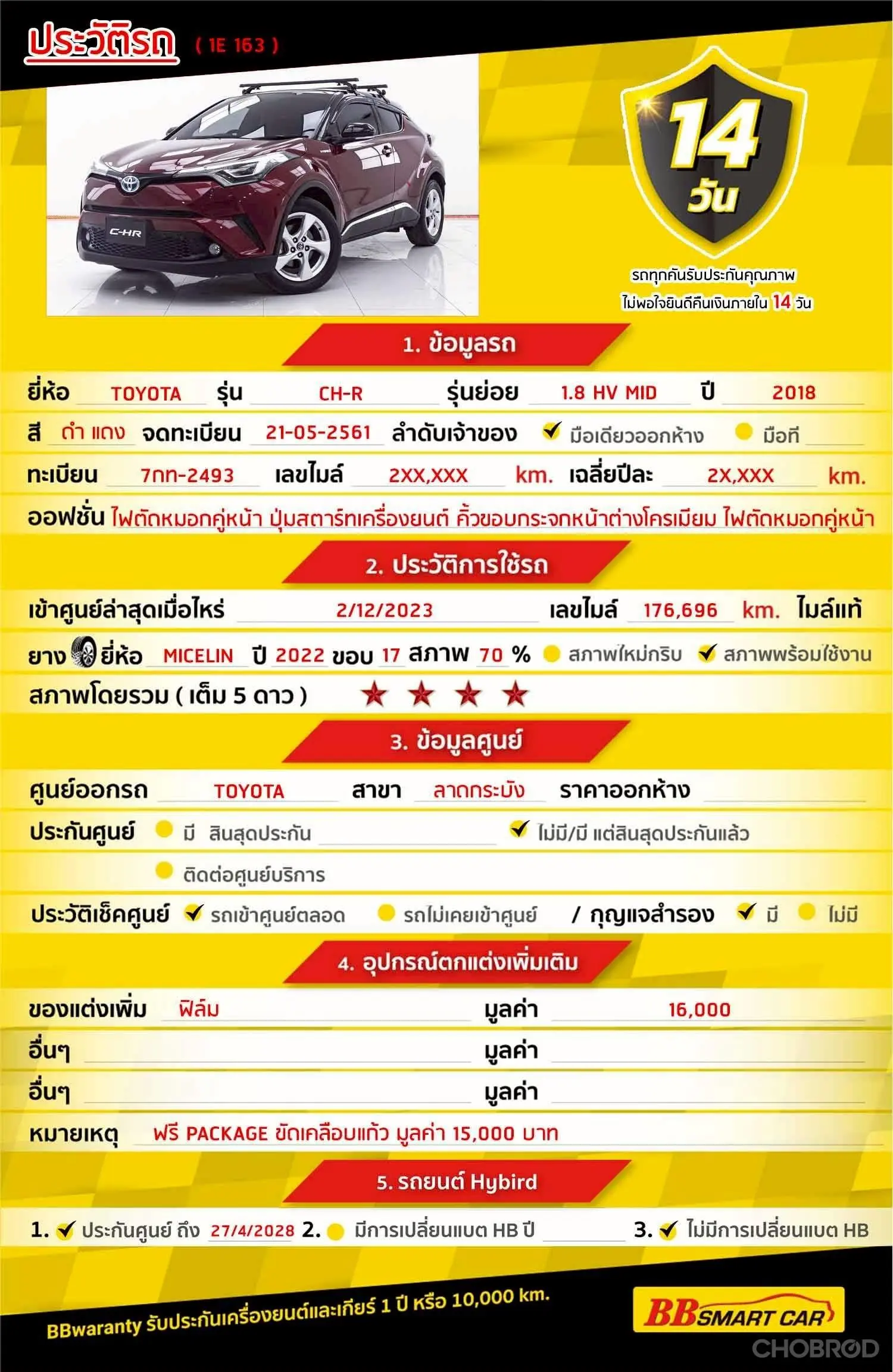 TOYOTA CH-R 1.8 HV MID AT 2018 ออกรถ 0 บาท จัดได้ 484,000 Line:@**********แสดงข้อมูล 🔥จอง 199 บาท ส่งบัตรประชาชน รู้ผลพิจารณาภายใน 30 นาที ไม่ผ่านคืนเงินจองทุกกรณี 🔥ซื้อรถกับ BB พร้อมให้คำปรึกษา แก้ทุกปัญหา ให้ทุกเรื่อง บริการ call center 24 ชม. 🔥BB Care Plus รับประกันหลังการขาย สูงสุด 2 ปี หรือ 20,000 km.. 🔥มีรถให้เลือกมากกว่า 1,800 คัน สาขา 1 สี่แยกมไหสวรรย์ ใกล้เดอะมอลล์ท่าพระ รหัสรถ 1E163 ราคา 464,000 บาท ผ่อนเพียง 7,935 บาท Brand. : TOYOTA Year. : 2018 Model. : CH-R Grade. : 1.8 HV MID Engine. : 1800 CC Type. : เบนซิน+ไฟฟ้า Gearbox : AT Color. : แดง-ดำ Mileage. : 208,XXX KM. (ซื้อสด ราคานี้ยังไม่รวมค่าดำเนินการ 10,000 บ.) 🚩 Price. 464,000 บาท ยอดจัด : 474,000 บาท เงินดาวน์ : 0 บาท ประกันภัย : ฟรีประกันภัย 1 ปี ค่าดำเนินการ : 10,000 บาท รวมออกรถ : 0 บาท ผ่อน 36 งวด = 15,268 บาท ผ่อน 48 งวด = 11,745 บาท ผ่อน 60 งวด = 9,759 บาท ผ่อน 72 งวด = 8,730 บาท ผ่อน 84 งวด = 7,935 บาท เงื่อนไขเป็นไปตามที่ไฟแนนซ์กำหนด โปรโมชั่นพิเศษ สำหรับลูกค้าเครดิตดีลือกรับเรทดอกเบี้ยพิเศษ 📍36 งวด = 1.29 % 📍48 งวด = 1.99 % 📍60 งวด = 2.39 % 📍72 งวด = 3.59 % 🔥 เงื่อนไข โปรโมชั่น ดอกเบี้ยเริ่มต้น 1.29% ตลอดอายุสัญญา - ยอดจัดไฟแนนซ์ 300,000-600,000 บาท - ผ่อนสูงสุด 72 เดือน - เป็นลูกค้าประวัติดี พนักงานประจำเงินเดือน 20,000 ขึ้นไป - ค่าดำเนินการแคมเปญ 20,000 บาท (รวมในยอดจัดได้) 🎗Car Hightlight รถสวยๆ วันนี้ขอแนะนำ TOYOTA CH-R 1.8 HV MID AT 2018 จุดเด่นออฟชั่น 1 : พวงมาลัยMuiltifunction 2 : ไมล์สถานะรถDigital 3 : แอร์Digital 🎗ภายใน ภายในห้องโดยสาร สีทูโทน ดำ – น้ำตาล เบาะนั่งหุ้มด้วยหนังสีดำ เบาะนั่งคนขับ พร้อมปุ่มปรับดันหลังไฟฟ้า Lumbar Support ช่องใส่เอกสารด้านหนังเบาะนั่งคู่หน้า ระบบกุญแจ Smart Keyless Entry ปุ่มสตาร์ทเครื่องยนต์ Push Start Button 🎗ภายนอก ไฟตัดหมอกคู่หน้า บังโคลนซุ้มล้อ ด้านหน้า – ด้านหลัง คิ้วขอบกระจกหน้าต่างโครเมียม คิ้วตกแต่งเสากลางภายนอกสีดำเงา Piano Black 🎗ความคุ้มค่า สำหรับคันนี้หากเปรียบเทียบราคากับคุณภาพ คันนี้ถือว่าคุ้มค่ามากค่ะ ผ่อนสบายๆก็มีรถขับได้ รถดีมีคุณภาพแบบนี้รีบตัดสินใจซื้อได้เลราคานี้มาไวไปไวนะคะ ⭐️การรับประกันหลังการขาย BB Care Plus สูงสุด 2 ปี หรือ 20,000 km. ด้วยช่างที่ผ่านการอบรมจากศูนย์ชั้นนำของประเทศ 🎉Special offer เฉพาะ บีบีสมาร์ทคาร์ ที่นี่ที่เดียว ⭐ดอกเบี้ยเริ่มต้น 1.29% มีไฟแนนซ์รองรับหลายที่ค่ะ ⭐ฟรี!! แพคเก็จ ขัดเคลือบแก้ว มูลค่า 15,000 บาท ทุกคัน ⭐อนุมัติไว 30 นาที นำเอกสารมาให้ครบรับรถกลับบ้านทันทีค่ะ ⭐BB Care Plus รับประกันหลังการขาย สูงสุด 2 ปี หรือ 20,000 km. ⭐มี 6 สาขา ในกรุงเทพและปริมณฑลใกล้บ้านท่าน ⭐รถทุกคันผ่านตรวจสอบ Inspection เรียบร้อยแล้วค่ะ ผ่าน 5 ดาวทุกคันค่ะ ⭐เซลล์ทุกท่านเป็นมืออาชีพพร้อมให้บริการทุกท่านแน่นอนค่ะ