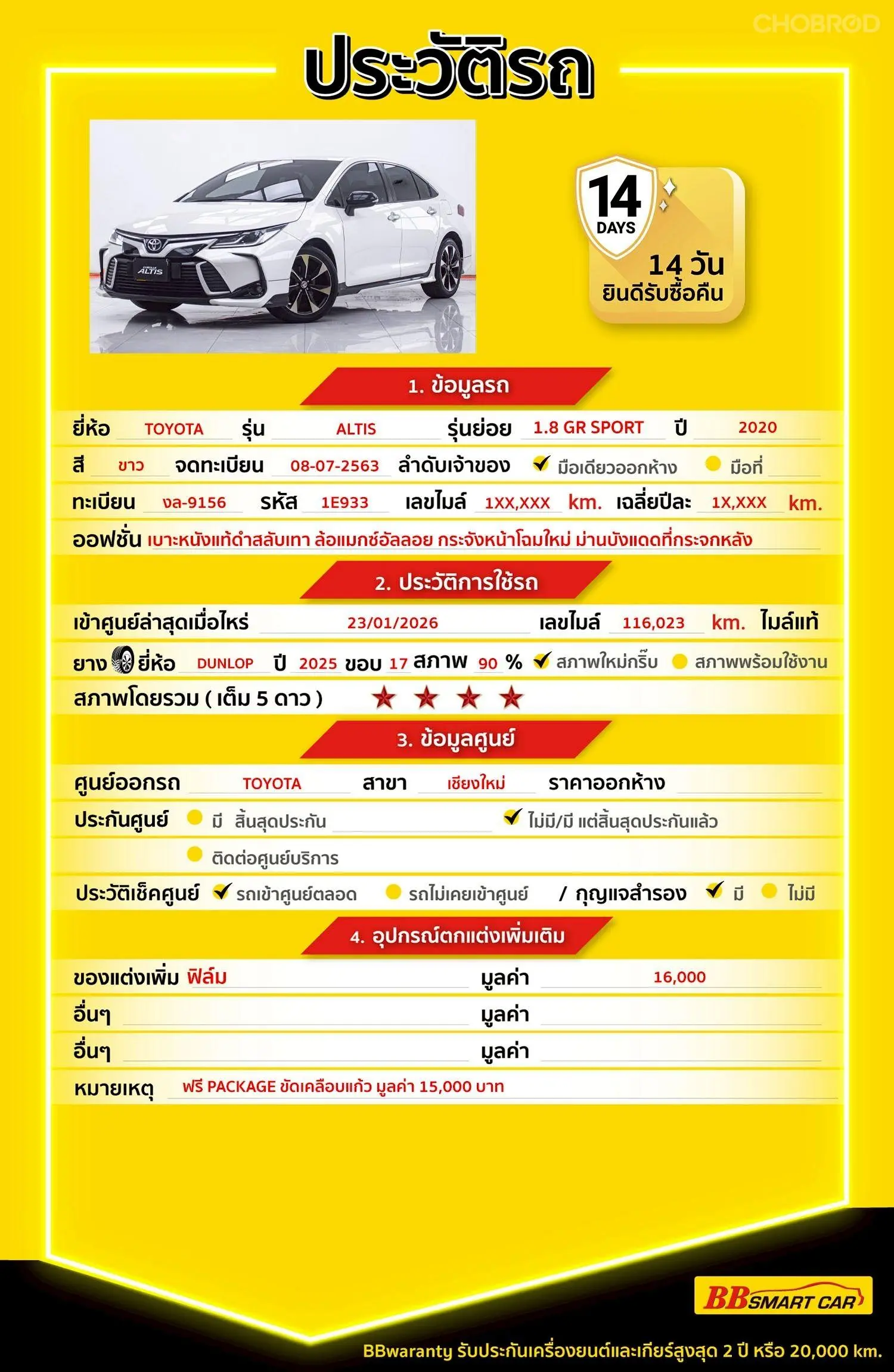 มีการรับประกันจากดีลเลอร์ (6 เดือน) มีบริการช่วยเหลือฉุกเฉินบนท้องถนน 24 ชม. จากดีลเลอร์