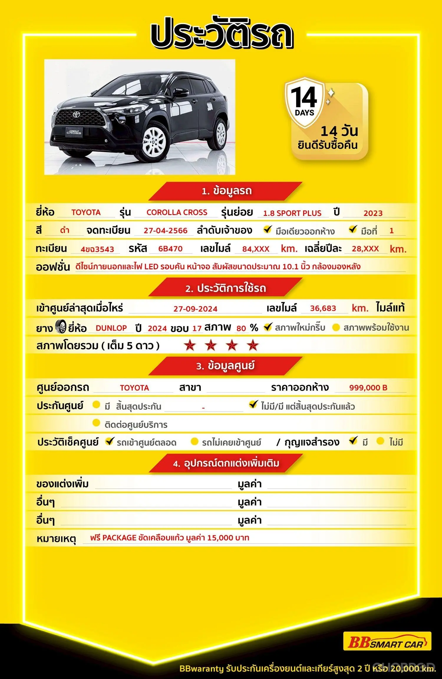 มีการรับประกันจากดีลเลอร์ (6 เดือน) มีบริการช่วยเหลือฉุกเฉินบนท้องถนน 24 ชม. จากดีลเลอร์