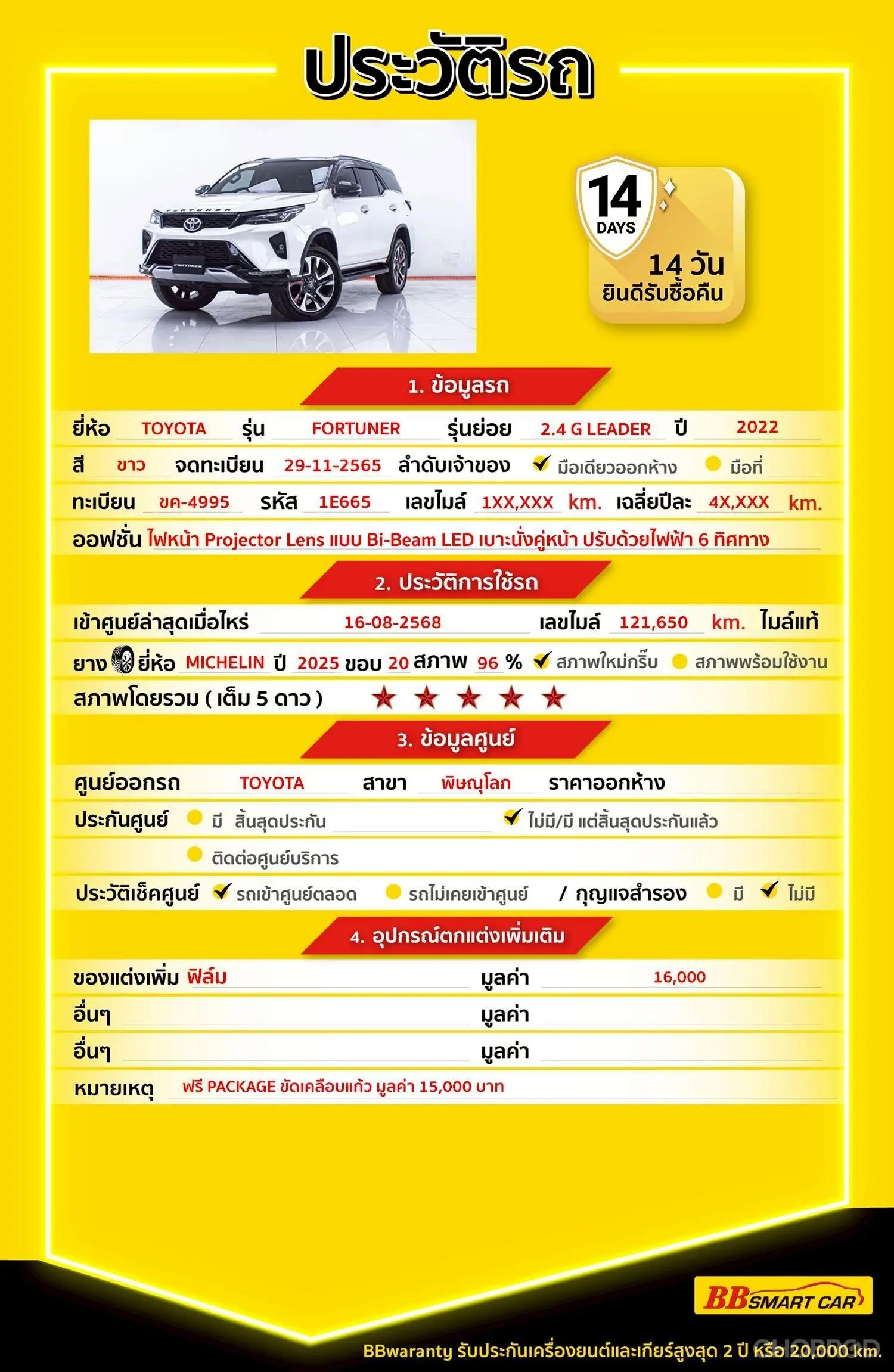TOYOTA FORTUNER 2.4 G LEADER AT 2022 ออกรถ 0 บาท 949,000 Line:@bbsmartcar 🔥จอง 199 บาท ส่งบัตรประชาชน รู้ผลพิจารณาภายใน 30 นาที ไม่ผ่านคืนเงินจองทุกกรณี 🔥ซื้อรถกับ BB พร้อมให้คำปรึกษา แก้ทุกปัญหา ให้ทุกเรื่อง บริการ call center 24 ชม. 🔥BB Care Plus รับประกันหลังการขาย สูงสุด 2 ปี หรือ 20,000 km.. 🔥มีรถให้เลือกมากกว่า 1,800 คัน สาขา 1 สี่แยกมไหสวรรย์ ใกล้เดอะมอลล์ท่าพระ รหัสรถ 1E665 ราคา 969,000 บาท ผ่อนเพียง 16,055 บาท Brand. : TOYOTA Year. : 2022 Model. : FORTUNER Grade. : 2.4 G LEADER Engine. : 2400 CC Type. : ดีเซล Gearbox : AT Color. : 2022 Mileage. : 134,XXX KM. (ซื้อสด ราคานี้ยังไม่รวมค่าดำเนินการ 10,000 บ.) 🚩 Price. 969,000 บาท ยอดจัด : 979,000 บาท เงินดาวน์ : 0 บาท ประกันภัย : ฟรีประกันภัย 1 ปี ค่าดำเนินการ : 10,000 บาท รวมออกรถ : 0 บาท ผ่อน 36 งวด = 29,607 บาท ผ่อน 48 งวด = 22,481 บาท ผ่อน 60 งวด = 19,745 บาท ผ่อน 72 งวด = 17,664 บาท ผ่อน 84 งวด = 16,055 บาท เงื่อนไขเป็นไปตามที่ไฟแนนซ์กำหนด โปรโมชั่นพิเศษ สำหรับลูกค้าเครดิตดีลือกรับเรทดอกเบี้ยพิเศษ 📍36 งวด = 1.29 % 📍48 งวด = 1.99 % 📍60 งวด = 2.39 % 📍72 งวด = 3.59 % 🔥 เงื่อนไข โปรโมชั่น ดอกเบี้ยเริ่มต้น 1.29% ตลอดอายุสัญญา - ยอดจัดไฟแนนซ์ 300,000-600,000 บาท - ผ่อนสูงสุด 72 เดือน - เป็นลูกค้าประวัติดี พนักงานประจำเงินเดือน 20,000 ขึ้นไป - ค่าดำเนินการแคมเปญ 20,000 บาท (รวมในยอดจัดได้) 🎗Car Hightlight รถสวยๆ วันนี้ขอแนะนำ TOYOTA FORTUNER 2.4 G LEADER AT ดีเซล 2022 จุดเด่นออฟชั่น 1 : ไฟหน้า Projector Lens แบบ Bi-Beam LED 2 : เบาะนั่งคู่หน้า ปรับด้วยไฟฟ้า 6 ทิศทาง 3 : พวงมาลัยมัลติฟังก์ชั่น 🎗ภายใน ช่วงล่างด้านหน้า : อิสระแบบปีกนกคู่ พร้อมคอยล์สปริง และ เหล็กกันโคลง ช่วงล่างด้านหลัง : แบบ 4-Link พร้อมคอยล์สปริง และ เหล็กกันโคลง ระบบเบรกด้านหน้า ดิสก์เบรก พร้อมครีบระบายความร้อน ระบบเบรกด้านหลัง ดิสก์เบรก พร้อมครีบระบายความร้อน พวงมาลัยแร็คแอนด์พีเนียน พร้อมพาวเวอร์ผ่อนแรงแบบ VFC 🎗ภายนอก ล้ออัลลอย ขนาด 18 นิ้ว พร้อมยาง 265/60 R18 ยางอะไหล่แบบ Full Size กระจังหน้า สีดำเงา และ โครเมียม ชุดตกแต่งกันชนหน้า สีเงิน บันไดข้าง สีเงิน ไฟหน้า Projector Lens แบบ Bi-Beam LED ระบบเปิด-ปิดไฟหน้า แบบอัตโนมัติ ระบบไฟหน้า Follow-me-home ระบบปรับระดับไฟหน้า สูง-ต่ำ อัตโนมัติ ไฟตัดหมอกคู่หน้า แบบ LED ไฟท้าย LED แบบ Light Guiding ไฟตัดหมอกด้านหลัง ไฟเบรกดวงที่ 3 แบบ LED 🎗ความคุ้มค่า สำหรับคันนี้หากเปรียบเทียบราคากับคุณภาพ คันนี้ถือว่าคุ้มค่ามากค่ะ ผ่อนสบายๆก็มีรถขับได้ รถดีมีคุณภาพแบบนี้รีบตัดสินใจซื้อได้เลราคานี้มาไวไปไวนะคะ ⭐️การรับประกันหลังการขาย BB Care Plus สูงสุด 2 ปี หรือ 20,000 km. ด้วยช่างที่ผ่านการอบรมจากศูนย์ชั้นนำของประเทศ 🎉Special offer เฉพาะ บีบีสมาร์ทคาร์ ที่นี่ที่เดียว ⭐ดอกเบี้ยเริ่มต้น 1.29% มีไฟแนนซ์รองรับหลายที่ค่ะ ⭐ฟรี!! แพคเก็จ ขัดเคลือบแก้ว มูลค่า 15,000 บาท ทุกคัน ⭐อนุมัติไว 30 นาที นำเอกสารมาให้ครบรับรถกลับบ้าน