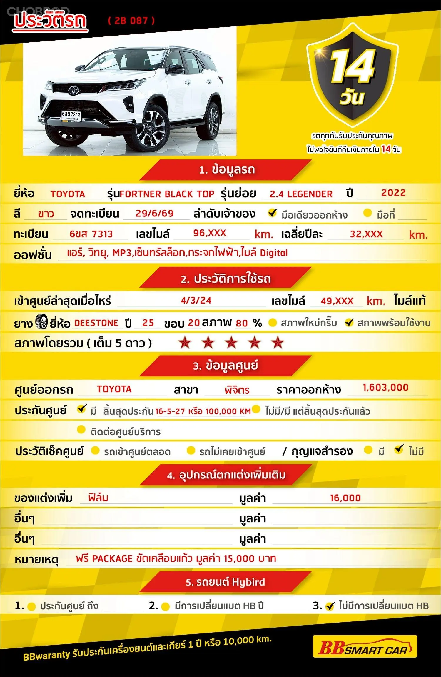TOYOTA FORTUNER 2.4 LEGENDER BLACK TOP AT 2022 ออกรถ 0 บาท จัดได้ 1,039,000 บ Line : @*******แสดงข้อมูล ***คลิ๊กที่ลิงค์เพื่อดู วิดีโอคันนี้,ประวัติรถ,รูปภาพภายนอกและภายใน https://www.bbsmartcar.com/web-php/index.php/site/cardetail/20250904898DBDE8200C 🔥จอง 199 บาท ส่งบัตรประชาชน รู้ผลอนุมัติภายใน 30 นาที ไม่ผ่านคืนเงินจองทุกกรณี 🔥ซื้อรถกับ BB พร้อมให้คำปรึกษา แก้ทุกปัญหา ให้ทุกเรื่อง บริการ call center 24 ชม. 🔥BB Care Plus รับประกันหลังการขาย สูงสุด 2 ปี หรือ 20,000km. 🔥มีรถให้เลือกมากกว่า 1,800 คัน บีบีสมาร์ทคาร์ 2 สาขาแคราย รหัสรถ 2B087 ราคา 1,019,000 บ. ผ่อนเพียง 17,562 บ. Brand. : TOYOTA Year. : 2022 Model. : FORTUNER Grade. : 2.4 LEGENDER BLACK TOP Engine. : 2400 Type. : ดีเซล Gearbox. : AT Color. : ขาว Mileage. : 96,400 km. (ซื้อสด ราคานี้ยังไม่รวมค่าดำเนินการ 10,000 บ.) 🚩 Price 1,019,000 บาท ยอดจัด : 1,029,000 บาท เงินดาวน์. : 0 บาท ประกันภัย : ฟรีประกันภัย 1 ปี ค่าดำเนินการ : 10,000 บาท รวมออกรถ 0 บาท ผ่อน36= 33,788 บาท ผ่อน48 = 25,994 บาท ผ่อน60 = 21,598 บาท ผ่อน72 = 19,321 บาท ผ่อน84 = 17,562 บาท **เงื่อนไขเป็นไปตามที่ไฟแนนซ์กำหนด** โปรโมชั่นพิเศษ สำหรับลูกค้าเครดิตดี 🚩เลือกรับเรทดอกเบี้ยพิเศษ 📍36 งวด = 1.29 % 📍48 งวด = 1.99 % 📍60 งวด = 2.39 % 📍72 งวด = 3.59 % 🔥 เงื่อนไข โปรโมชั่น ดอกเบี้ยเริ่มต้น 1.29% ตลอดอายุสัญญา - ยอดจัดไฟแนนซ์ 300,000-600,0000 บาท - ผ่อนสูงสุด 72 เดือน - เป็นลูกค้าประวัติดี พนักงานประจำเงินเดือน 20,000 ขึ้นไป - ค่าดำเนินการแคมเปญ 20,000 บาท (รวมในยอดจัดได้) 🎗Car Hightlight. TOYOTA FORTUNER เครื่อง 2400 cc. รถยนต์เอนกประสงค์ นั่งสบายถึง 7 ที่นั่ง พร้อมเทคโนโลยีเพื่อความปลอดภัยและเป็นรถยนต์อเนกประสงค์ มาพร้อมเทคโนโลยีล้ำสมัย กระจังหนัาดีไซน์ใหม่ เท่ ดุดันกว่าเดิม 🎗ภายใน. ภายในกว้างขวาง สวยหรูโดนใจสุดๆ มาพร้อมเทคโนโลยีอำนวยความสะดวกมากมาย พวงมาลัยเพาเวอร์ ไมล์ Digital เกียร์ Paddle Shift กระจกมองข้างปรับไฟฟ้า วิทยุ - CD แอร์ AUTO เซ็นทรัลล๊อก เบาะไฟฟ้าคู่หน้า พวงมาลัย Multifunction เบรกมือไฟฟ้า เบรค ABS Cruise Control Airbag แอร์ 🎗ภายนอก. ตัวรถสีขาว หลังคาดำสุดหรู มาพร้อมกระจกไฟฟ้า กระจกมองข้างพับไฟฟ้า ไฟเลี้ยวกระจกมองข้าง ล้อแม็ก ไฟตัดหมอก 🎗ความคุ้มค่า สำหรับคันนี้หากเปรียบเทียบราคากับคุณภาพ ถือว่าคุ้มค่ามากครับ ผ่อนสบายๆก็มีรถขับได้ รถดีมีคุณภาพแบบนี้รีบตัดสินใจซื้อได้เลย ราคานี้มาไวไปไวนะคะ ⭐️การรับประกันหลังการขาย BB Care Plus สูงสุด 2 ปี หรือ 20,000 km. ด้วยช่างที่ผ่านการอบรมจากศูนย์ชั้นนำของประเทศ 🎉🎉 Special offer เฉพาะ บีบีสมาร์ทคาร์ ที่นี่ที่เดียว ⭐️ดอกเบี้ยเริ่มต้น 1.29% มีไฟแนนซ์รองรับหลายที่ค่ะ ⭐️ฟรี!! แพคเก็จ ขัดเคลือบแก้ว มูลค่า 15,000 บาท ทุกคัน ⭐️อนุมัติไว 30 นาที นำเอกสารมาให้ครบรับรถกลับบ้านทันทีค่ะ ⭐️BB Care Plus รับประกันหลังการขาย สูงสุด 2 ปี หรือ 20,000 km. ⭐️มี 6 สาขา ในกรุงเทพและปริมณฑลใกล้บ้านท่าน ⭐️รถทุกคันผ่านตรวจสอบ Inspection เรียบแล้
