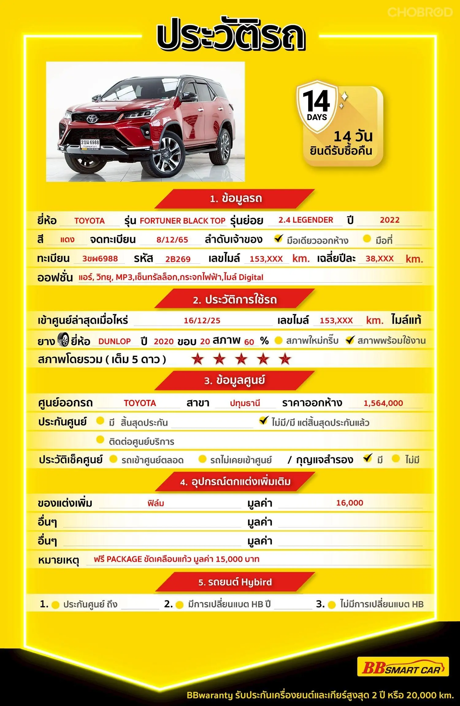 TOYOTA FORTUNER 2.4 LEGENDER BLACK TOP AT 2022 ออกรถ 0 บาท รหัสรถ 2B269 Line ID : @bbcar02 🔥มีรถให้เลือกมากกว่า 1,800 คัน 🔥รถทุกคันผ่านตรวจสอบ Inspection เรียบแล้วค่ะ ผ่าน 5 ดาวทุกคันค่ะ 🔥ซื้อรถกับ BB พร้อมให้คำปรึกษา แก้ทุกปัญหา ให้ทุกเรื่อง บริการ call center 24 ชม. 🔥BB Care Plus รับประกันหลังการขาย สูงสุด 2 ปี หรือ 20,000 km. 🔥ฟรี!! แพคเก็จ ขัดเคลือบแก้ว มูลค่า 15,000 บาท ทุกคัน 🔥มี 6 สาขา ในกรุงเทพและปริมณฑลใกล้บ้านท่าน สาขา2 สี่แยกแครายใกล้เดอะมอลล์งามวงศ์วาน รหัสรถ 2B269 ราคา 924,000 บ. ผ่อนเพียง 15,720 บ. Brand. : TOYOTA Year. : 2022 Model. : FORTUNER Grade. : 2.4 LEGENDER BLACK TOP Engine. : 2400 Type. : ดีเซล Gearbox. : AT Color. : แดง Mileage. : 153,600 km. (ซื้อสด ราคานี้ยังไม่รวมค่าดำเนินการ 10,000 บ.) 🚩 Price 924,000 บาท ยอดจัด : 934,000 บาท เงินดาวน์. : 0 บาท ประกันภัย : ฟรีประกันภัย 1 ปี ค่าดำเนินการ : 10,000 บาท รวมออกรถ 0 บาท ผ่อน36= 30,246 บาท ผ่อน48 = 23,268 บาท ผ่อน60 = 19,333 บาท ผ่อน72 = 17,295 บาท ผ่อน84 = 15,720 บาท **เงื่อนไขเป็นไปตามที่ไฟแนนซ์กำหนด** โปรโมชั่นพิเศษ สำหรับลูกค้าเครดิตดี 🚩เลือกรับเรทดอกเบี้ยพิเศษ 📍36 งวด = 1.29 % 📍48 งวด = 1.99 % 📍60 งวด = 2.39 % 📍72 งวด = 3.59 % 🔥 เงื่อนไข โปรโมชั่น ดอกเบี้ยเริ่มต้น 1.29% ตลอดอายุสัญญา - ยอดจัดไฟแนนซ์ 300,000-600,0000 บาท - ผ่อนสูงสุด 72 เดือน - เป็นลูกค้าประวัติดี พนักงานประจำเงินเดือน 20,000 ขึ้นไป - ค่าดำเนินการแคมเปญ 20,000 บาท (รวมในยอดจัดได้) 🎗Car Hightlight. TOYOTA FORTUNER เครื่อง 2400 cc. รถยนต์เอนกประสงค์ นั่งสบายถึง 7 ที่นั่ง พร้อมเทคโนโลยีเพื่อความปลอดภัยและเป็นรถยนต์อเนกประสงค์ มาพร้อมเทคโนโลยีล้ำสมัย กระจังหนัาดีไซน์ใหม่ เท่ ดุดันกว่าเดิม 🎗ภายใน. ภายในกว้างขวาง สวยหรูโดนใจสุดๆ มาพร้อมเทคโนโลยีอำนวยความสะดวกมากมาย พวงมาลัยเพาเวอร์ ไมล์ Digital เกียร์ Paddle Shift กระจกมองข้างปรับไฟฟ้า วิทยุ - CD แอร์ AUTO เซ็นทรัลล๊อก เบาะไฟฟ้าคู่หน้า พวงมาลัย Multifunction เบรกมือไฟฟ้า เบรค ABS Cruise Control Airbag แอร์ 🎗ภายนอก. ตัวรถสีแดง หลังคาดำสุดหรู มาพร้อมกระจกไฟฟ้า กระจกมองข้างพับไฟฟ้า ไฟเลี้ยวกระจกมองข้าง ล้อแม็ก ไฟตัดหมอก 🎗ความคุ้มค่า สำหรับคันนี้หากเปรียบเทียบราคากับคุณภาพ ถือว่าคุ้มค่ามากครับ ผ่อนสบายๆก็มีรถขับได้ รถดีมีคุณภาพแบบนี้รีบตัดสินใจซื้อได้เลย ราคานี้มาไวไปไวนะคะ