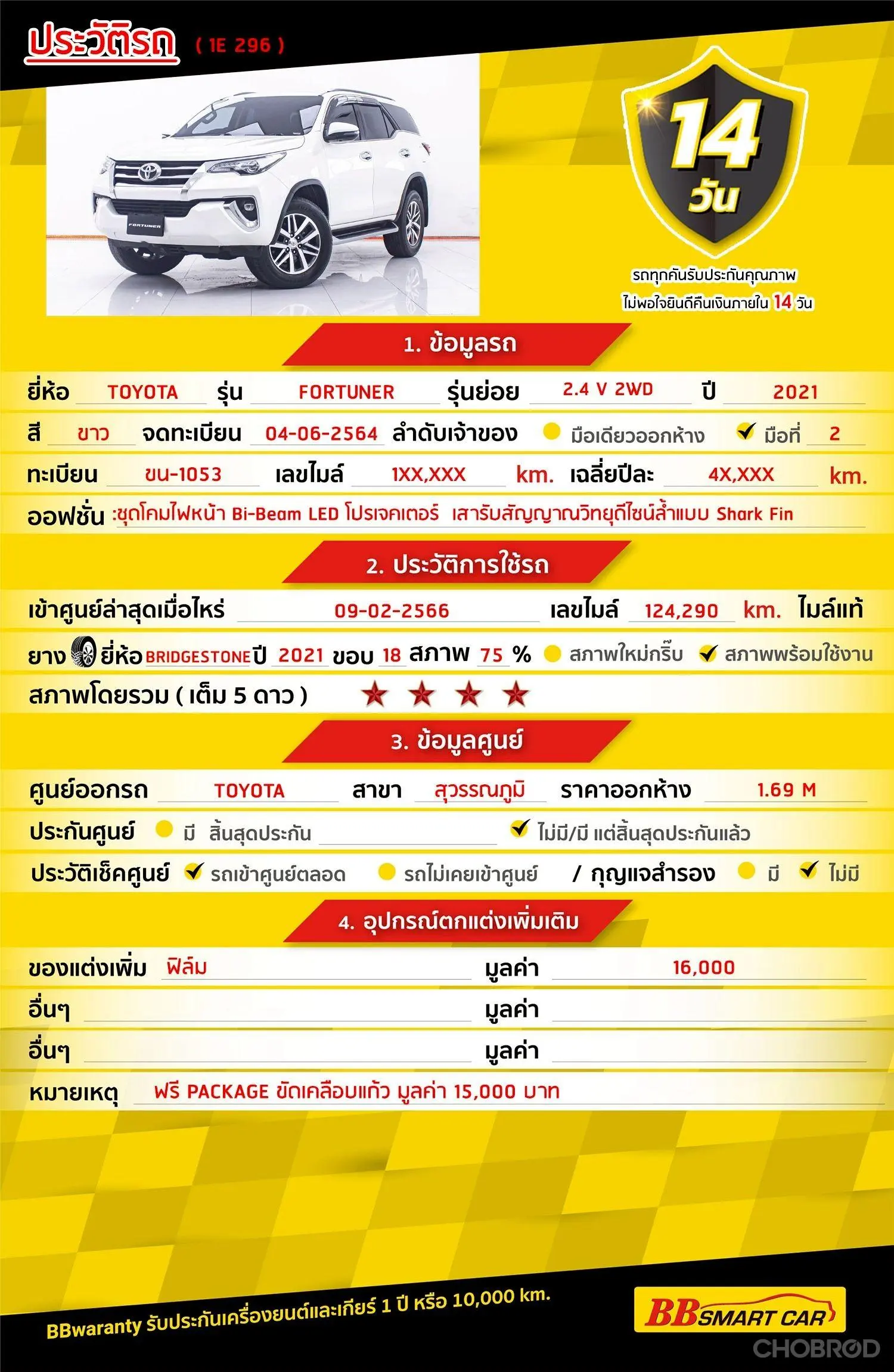 มีการรับประกันจากดีลเลอร์ (6 เดือน) มีบริการช่วยเหลือฉุกเฉินบนท้องถนน 24 ชม. จากดีลเลอร์