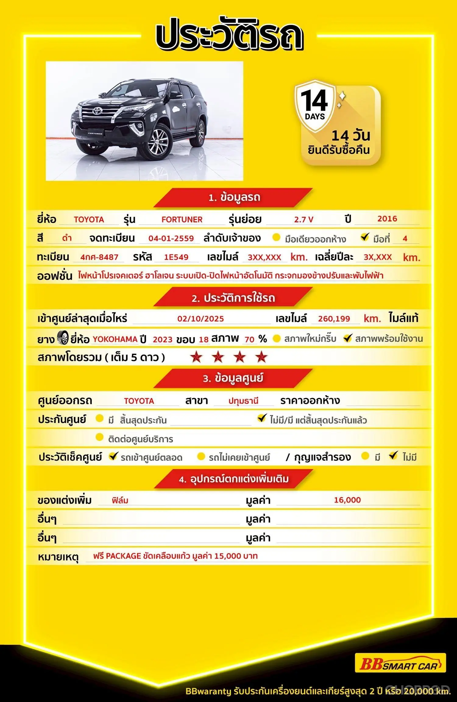 TOYOTA FORTUNER 2.7 V AT 2016 ออกรถ 0 บาท จัดได้ 659,000 Line:@**********แสดงข้อมูล 🔥จอง 199 บาท ส่งบัตรประชาชน รู้ผลพิจารณาภายใน 30 นาที ไม่ผ่านคืนเงินจองทุกกรณี 🔥ซื้อรถกับ BB พร้อมให้คำปรึกษา แก้ทุกปัญหา ให้ทุกเรื่อง บริการ call center 24 ชม. 🔥BB Care Plus รับประกันหลังการขาย สูงสุด 2 ปี หรือ 20,000 km.. 🔥มีรถให้เลือกมากกว่า 1,800 คัน สาขา 1 สี่แยกมไหสวรรย์ ใกล้เดอะมอลล์ท่าพระ รหัสรถ 1E549 ราคา 639,000 บาท ผ่อนเพียง 11,676 บาท Brand. : TOYOTA Year. : 2016 Model. : FORTUNER Grade. : 2.7 V Engine. : 2700 CC Type. : เบนซิน+LPG Gearbox : AT Color. : ดำ Mileage. : 330,XXX KM. (ซื้อสด ราคานี้ยังไม่รวมค่าดำเนินการ 10,000 บ.) 🚩 Price. 639,000 บาท ยอดจัด : 649,000 บาท เงินดาวน์ : 0 บาท ประกันภัย : ฟรีประกันภัย 1 ปี ค่าดำเนินการ : 10,000 บาท รวมออกรถ : 0 บาท ผ่อน 36 งวด = 21,541 บาท ผ่อน 48 งวด = 16,719 บาท ผ่อน 60 งวด = 13,941 บาท ผ่อน 72 งวด = 12,533 บาท ผ่อน 84 งวด = 11,676 บาท เงื่อนไขเป็นไปตามที่ไฟแนนซ์กำหนด โปรโมชั่นพิเศษ สำหรับลูกค้าเครดิตดีลือกรับเรทดอกเบี้ยพิเศษ 📍36 งวด = 1.29 % 📍48 งวด = 1.99 % 📍60 งวด = 2.39 % 📍72 งวด = 3.59 % 🔥 เงื่อนไข โปรโมชั่น ดอกเบี้ยเริ่มต้น 1.29% ตลอดอายุสัญญา - ยอดจัดไฟแนนซ์ 300,000-600,000 บาท - ผ่อนสูงสุด 72 เดือน - เป็นลูกค้าประวัติดี พนักงานประจำเงินเดือน 20,000 ขึ้นไป - ค่าดำเนินการแคมเปญ 20,000 บาท (รวมในยอดจัดได้) 🎗Car Hightlight รถสวยๆ วันนี้ขอแนะนำ TOYOTA FORTUNER 2.7 V AT 2016 จุดเด่นออฟชั่น 1 : เครื่องยนต์เบนซิน ขนาด 2.7 ลิตร 2 : กำลังสูงสุด 166 แรงม้า แรงบิด 245 นิวตันเมตร 3 : รองรับน้ำมันสูงสุด E20 🎗ภายใน - ระบบเปิด-ปิดไฟหน้าอัตโนมัติ - สวิตซ์ปรับระดับไฟหน้าสูง-ต่ำ - ระบบไฟหน้า Follow me home - ภายในห้องโดยสารโทนสีดำ-น้ำตาล - เบาะนั่งหุ้มด้วยผ้าสีน้ำตาล - เบาะแถวที่ 2 ปรับเลื่อนหน้า-หลัง และเอนได้ - เบาะแถวที่ 3 ปรับเอนได้ - เบาะแถวที่ 3 ยกขึ้นแขวนเก็บ - ตกแต่งด้วยวัสดุลายไม้ - พวงมาลัยปรับ 4 ทิศทาง (ขึ้น-ลง-เข้า-ออก) - มาตรวัดเรืองแสง - จอแสดงข้อมูลการขับขี่ MID แบบ TFT - ปุ่มสตาร์ทเครื่องยนต์ Push Start Button - ระบบกุญแจอัจฉริยะ Smart Keyless Entry - กระจกไฟฟ้าอัตโนมัติ 4 บาน ป้องกันการหนีบ 🎗ภายนอก - ล้ออัลลอยขนาด 18 นิ้ว - พร้อมยาง 265/60 R18 - ไฟหน้าโปรเจคเตอร์ ฮาโลเจน - ไฟ Daytime Running Lights ฮาโลเจน - บันไดข้าง - ไฟท้าย LED พร้อมไฟหรี่ Lighting Guide - กระจกมองข้างปรับและพับไฟฟ้า - ราวหลังคาแบบ Roof rail 🎗ความคุ้มค่า สำหรับคันนี้หากเปรียบเทียบราคากับคุณภาพ คันนี้ถือว่าคุ้มค่ามากค่ะ ผ่อนสบายๆก็มีรถขับได้ รถดีมีคุณภาพแบบนี้รีบตัดสินใจซื้อได้เลยราคานี้มาไวไปไวนะคะ ⭐️การรับประกันหลังการขาย BB Care Plus สูงสุด 2 ปี หรือ 20,000 km. ด้วยช่างที่ผ่านการอบรมจากศูนย์ชั้นนำของประเทศ 🎉Special offer เฉพาะ บีบีสมาร์ทคาร์ ที่นี่ที่เดียว ⭐ดอกเบี้ยเริ่มต้น 1.29% มีไฟแนนซ์รองรับหลายที่ค่ะ ⭐ฟรี!! แพคเก็จ ขัดเคลือบแก้ว มูลค่า 15,000 บาท ทุกคัน ⭐อนุมัติไว 30 นาที น