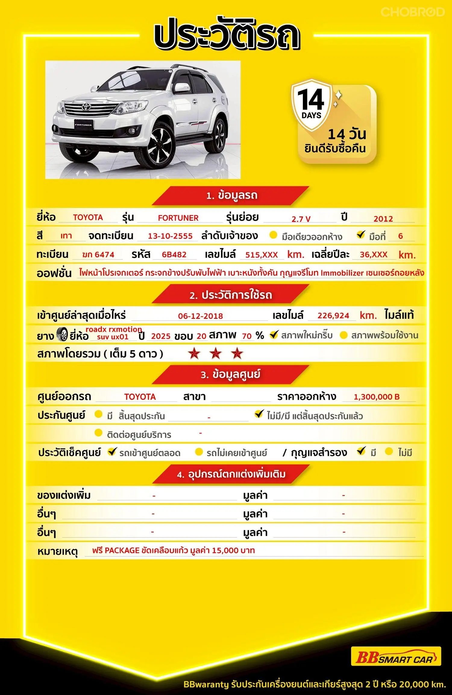 มีการรับประกันจากดีลเลอร์ (6 เดือน) มีบริการช่วยเหลือฉุกเฉินบนท้องถนน 24 ชม. จากดีลเลอร์