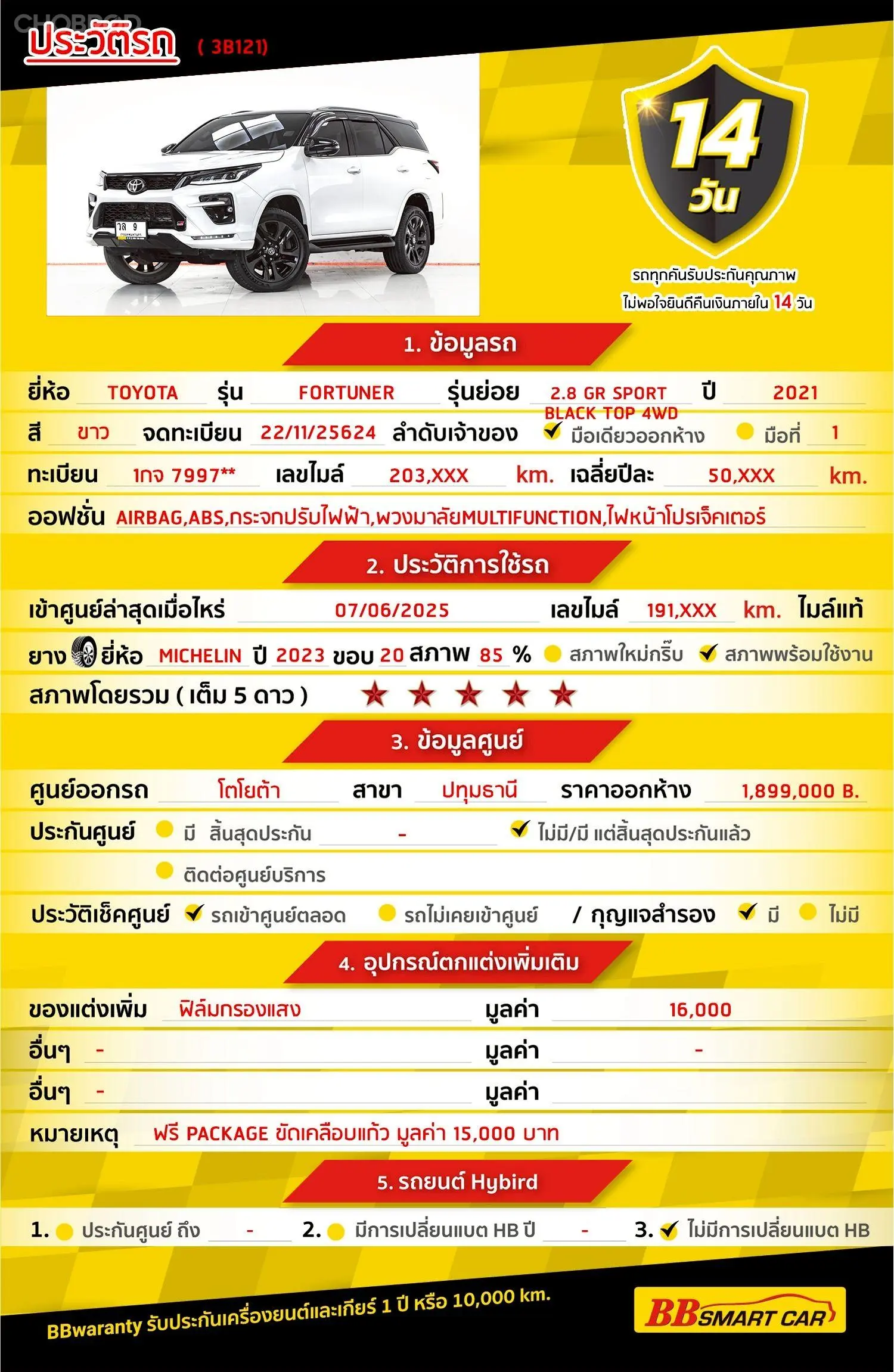 TOYOTA FORTUNER 2.8 GR SPORT AT4WD 2021 ออกรถ 0 บาท จัดได้ 1,199,000 บ. Line:@*******แสดงข้อมูล 🔥 จอง 199 บาท ส่งบัตรประชาชน รู้ผลอนุมัติภายใน 30 นาที ไม่ผ่านคืนเงินจองทุกกรณี 🔥 ซื้อรถกับ BB พร้อมให้คำปรึกษา แก้ทุกปัญหา ให้ทุกเรื่อง บริการ call center 24 ชม. 🔥 BB Care Plus รับประกันหลังการขาย สูงสุด 2 ปี หรือ 20,000 km. 🔥 มีรถให้เลือกมากกว่า 1,600 คัน บีบี3 สาขาบางใหญ่ (ใกล้โลตัสบางใหญ่) รหัสรถ 3B121 ราคา 1,259,000 บ. ผ่อนเพียง 18,567 บ. Brand : TOYOTA Year : 2021 Model : FORTUNER Grade : 2.8 GR SPORT Engine : 2800 CC. Type : ดีเซล Gearbox : AT4WD Color : ขาว Mileage : 203,xxx km. (ซื้อสด ราคานี้ยังไม่รวมค่าดำเนินการ 10,000 บ.) 🎗 Price 1,259,000 บาท ยอดจัด : 1,269,000 บาท เงินดาวน์ : ฟรีเงินดาวน์ ประกันภัย : ฟรีประกันภัย 1 ปี ค่าดำเนินการ : 10,000 บาท รวมออกรถ : 0 บาท ผ่อน 36 = 35,721 บาท ผ่อน 48 = 27,481 บาท ผ่อน 60 = 22,833 บาท ผ่อน 72 = 20,426 บาท ผ่อน 84 = 18,567 บาท *เงื่อนไขเป็นไปตามที่ไฟแนนซ์กำหนด โปรโมชั่นพิเศษ สำหรับลูกค้าเครดิตดี 🚩เลือกรับเรทดอกเบี้ยพิเศษ 📍36 งวด = 1.29% 📍48 งวด = 1.99% 📍60 งวด = 2.39% 📍72 งวด = 3.59% 🔥 เงื่อนไข โปรโมชั่น ดอกเบี้ยเริ่มต้น 1.29% ตลอดอายุสัญญา - ยอดจัดไฟแนนซ์ 300,000-600,0000 บาท - ผ่อนสูงสุด 72 เดือน - เป็นลูกค้าประวัติดี พนักงานประจำ เงินเดือน 20,000 บาท ขึ้นไป - ค่าดำเนินการแคมเปญ 20,000 บาท (รวมในยอดจัดได้) 🎗Car Hightlight TOYOTA FORTUNER เครื่อง 2800 cc. เกียร์ออโต้ รถยนต์เอนกประสงค์ นั่งสบายถึง 7 ที่นั่ง พร้อมเทคโนโลยีเพื่อความปลอดภัยและเป็นรถยนต์อเนกประสงค์ มาพร้อมเทคโนโลยีล้ำสมัย 🎗ภายใน ภายในกว้างขวาง สวยหรูโดนใจสุดๆ มาพร้อมเทคโนโลยีอำนวยความสะดวกมากมาย จอ LCD เล่น DVD เบาะไฟฟ้าคู่หน้า พวงมาลัยเพาเวอร์ ไมล์ Digital แอร์ กุญแจรีโมท-สัญญานกันขโมย กระจกไฟฟ้า เบรค ABS กระจกมองข้างปรับไฟฟ้า Cruise Control พวงมาลัย Multifunction เบาะหนังแท้ แอร์ราว Navigator เกียร์ Paddle Shift Airbag วิทยุ - CD เซ็นทรัลล๊อก แอร์ AUTO 🎗ภายนอก ตัวรถสีขาว ดูเท่เรียบหรูดูแพง เซนเซอร์ถอยหลัง ไฟเลี้ยวกระจกมองข้าง กระจกมองข้างพับไฟฟ้า บันไดข้าง ไฟโปรเจคเตอร์ กล้องส่องหลัง คิ้วกันสาด ไฟตัดหมอก ไฟซีนอน เซนเซอร์ถอยหลังตัวรถดูแข็งแรงทนทานสุดๆ 🎗ความคุ้มค่า สำหรับใครที่กำลังมองหารถใหม่ลองเข้ามาดู ประหยัดเงินไปเยอะมาก ใช้งานสะดวกสบาย ประหยัดน้ำมันมากๆ เทียบกับราคานี้ถือว่าคุ้มค่ามากๆ ทีมงานทำราคาที่ดีที่สุดเหมาะสมกับสภาพรถเทียบกับสเปคเดียวกันรับประกันเราขายถูกกว่าแน่นอน ⭐การรับประกันหลังการขาย BB Care Plus สูงสุด 2 ปี หรือ 20,000 km. ด้วยช่างที่ผ่านการอบรมจากศูนย์ชั้นนำของประเทศ 🎉Special offer เฉพาะ บีบีสมาร์ทคาร์ ที่นี่ที่เดียว ⭐ดอกเบี้ยเริ่มต้น 1.29% มีไฟแนนซ์รองรับหลายที่ค่ะ ⭐ฟรี!! แพคเก็จ ขัดเคลือบแก้ว มูลค่า 15,000 บาท ทุกคัน ⭐อนุมัติไว 30 นาที นำเอกสารมาให้ครบรับรถกลับบ้านทันทีค่ะ ⭐BB Care Plus รับประ