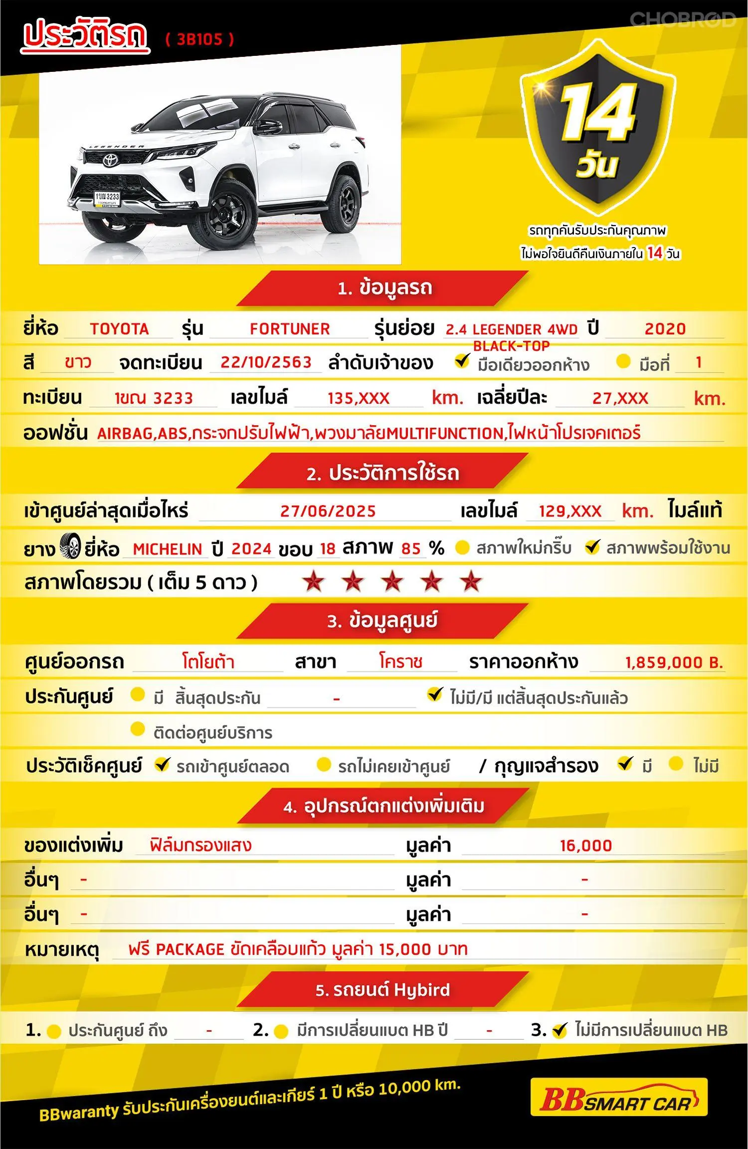 TOYOTA FORTUNER 2.4 LEGENDER AT4WD 2020 ออกรถ 0 บาท จัดได้ 1,054,000 บ. Line:@*******แสดงข้อมูล 🔥 จอง 199 บาท ส่งบัตรประชาชน รู้ผลอนุมัติภายใน 30 นาที ไม่ผ่านคืนเงินจองทุกกรณี 🔥 ซื้อรถกับ BB พร้อมให้คำปรึกษา แก้ทุกปัญหา ให้ทุกเรื่อง บริการ call center 24 ชม. 🔥 BB Care Plus รับประกันหลังการขาย สูงสุด 2 ปี หรือ 20,000 km. 🔥 มีรถให้เลือกมากกว่า 1,800 คัน บีบี3 สาขาบางใหญ่ (ใกล้โลตัสบางใหญ่) รหัสรถ 3B105 ราคา 1,034,000 บ. ผ่อนเพียง 17,730 บ. Brand : TOYOTA Year : 2020 Model : FORTUNER Grade : 2.4 LEGENDER BLACKTOP Engine : 2400 CC. Type : ดีเซล Gearbox : AT4WD Color : ขาว Mileage : 135,xxx km. (ซื้อสด ราคานี้ยังไม่รวมค่าดำเนินการ 10,000 บ.) 🎗 Price 1,034,000 บาท ยอดจัด : 1,044 ,000 บาท เงินดาวน์ : ฟรีเงินดาวน์ ประกันภัย : ฟรีประกันภัย 1 ปี ค่าดำเนินการ : 10,000 บาท รวมออกรถ : 0 บาท ผ่อน 36 = 34,111 บาท ผ่อน 48 = 26,242 บาท ผ่อน 60 = 21,803 บาท ผ่อน 72 = 19,506 บาท ผ่อน 84 = 17,730 บาท *เงื่อนไขเป็นไปตามที่ไฟแนนซ์กำหนด โปรโมชั่นพิเศษ สำหรับลูกค้าเครดิตดี 🚩เลือกรับเรทดอกเบี้ยพิเศษ 📍36 งวด = 1.29% 📍48 งวด = 1.99% 📍60 งวด = 2.39% 📍72 งวด = 3.59% 🔥 เงื่อนไข โปรโมชั่น ดอกเบี้ยเริ่มต้น 1.29% ตลอดอายุสัญญา - ยอดจัดไฟแนนซ์ 300,000-600,0000 บาท - ผ่อนสูงสุด 72 เดือน - เป็นลูกค้าประวัติดี พนักงานประจำ เงินเดือน 20,000 บาท ขึ้นไป - ค่าดำเนินการแคมเปญ 20,000 บาท (รวมในยอดจัดได้) 🎗Car Hightlight TOYOTA FORTUNER เครื่อง 2800 cc. เกียร์ออโต้ รถยนต์เอนกประสงค์ นั่งสบายถึง 7 ที่นั่ง พร้อมเทคโนโลยีเพื่อความปลอดภัยและเป็นรถยนต์อเนกประสงค์ มาพร้อมเทคโนโลยีล้ำสมัย 🎗ภายใน ภายในกว้างขวาง สวยหรูโดนใจสุดๆ Airbag แอร์ AUTO พวงมาลัยเพาเวอร์ วิทยุ - CD เบรค ABS Cruise Control เกียร์ Paddle Shift เบาะหนังแท้ ไมล์ Digital กุญแจรีโมท-สัญญานกันขโมย Navigator จอ LCD เล่น DVD พวงมาลัย Multifunction แอร์ กระจกมองข้างปรับไฟฟ้า แอร์ราว เซ็นทรัลล๊อก เบาะไฟฟ้าคู่หน้า 🎗ภายนอก ตัวรถสีขาว ดูเท่เรียบหรูดูแพง พร้อม Option กระจกไฟฟ้า บันไดข้าง ไฟซีนอน เซนเซอร์ถอยหลัง ไฟเลี้ยวกระจกมองข้าง ไฟตัดหมอก ไฟโปรเจคเตอร์ ล้อแม็ก กระจกมองข้างพับไฟฟ้า กล้องส่องหลัง 🎗ความคุ้มค่า สำหรับใครที่กำลังมองหารถใหม่ลองเข้ามาดู ประหยัดเงินไปเยอะมาก ใช้งานสะดวกสบาย ประหยัดน้ำมันมากๆ เทียบกับราคานี้ถือว่าคุ้มค่ามากๆ ทีมงานทำราคาที่ดีที่สุดเหมาะสมกับสภาพรถเทียบกับสเปคเดียวกันรับประกันเราขายถูกกว่าแน่นอน ⭐การรับประกันหลังการขาย BB Care Plus สูงสุด 2 ปี หรือ 20,000 km. ด้วยช่างที่ผ่านการอบรมจากศูนย์ชั้นนำของประเทศ 🎉Special offer เฉพาะ บีบีสมาร์ทคาร์ ที่นี่ที่เดียว ⭐ดอกเบี้ยเริ่มต้น 1.29% มีไฟแนนซ์รองรับหลายที่ค่ะ ⭐ฟรี!! แพคเก็จ ขัดเคลือบแก้ว มูลค่า 15,000 บาท ทุกคัน ⭐อนุมัติไว 30 นาที นำเอกสารมาให้ครบรับรถกลับบ้านทันทีค่ะ ⭐BB Care Plus รับประกันหลังการขาย สูงสุด 2 ปี หรือ 20,000 km. ⭐มี 6 สาขา ในกรุงเทพและปริมณฑลใกล้บ้านท