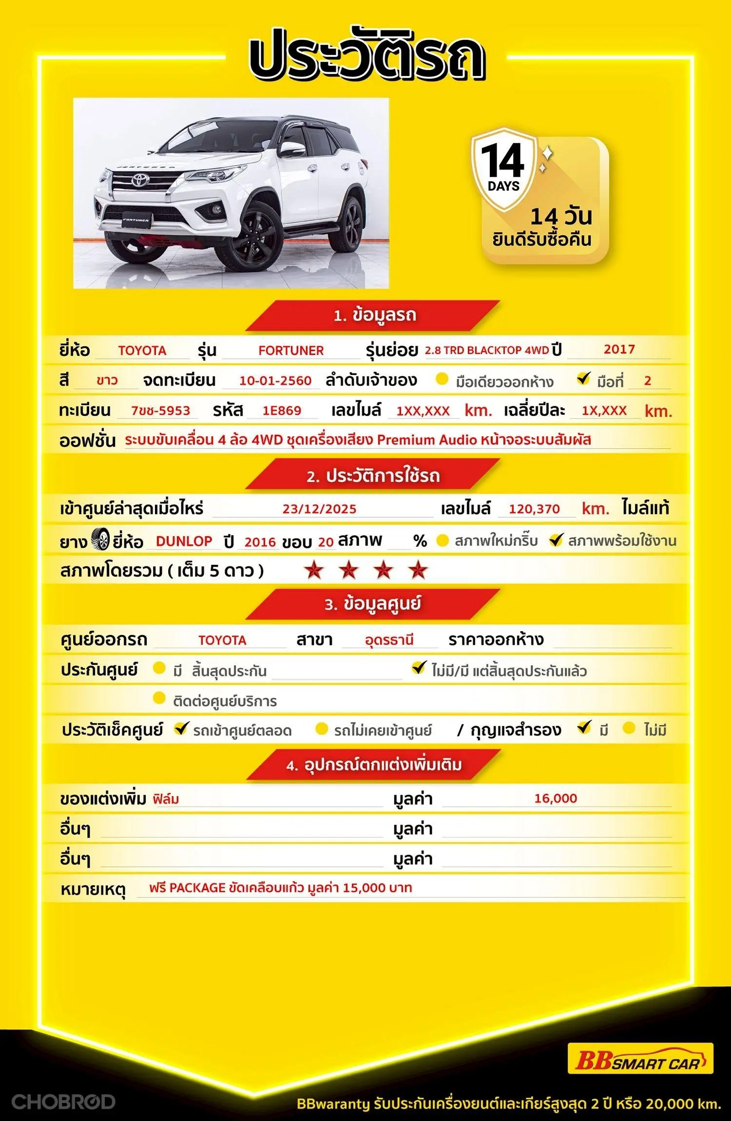 TOYOTA FORTUNER 2.8 TRD BLACKTOP 4WD AT 2017 ออกรถ 0 บาท 899,000 บ. Line : @**********แสดงข้อมูล 🔥มีรถให้เลือกมากกว่า 1,800 คัน 🔥รถทุกคันผ่านตรวจสอบ Inspection เรียบร้อยแล้วค่ะ ผ่าน 5 ดาวทุกคันค่ะ 🔥ซื้อรถกับ BB พร้อมให้คำปรึกษา แก้ทุกปัญหา ให้ทุกเรื่อง บริการ call center 24 ชม. 🔥BB Care Plus รับประกันหลังการขาย สูงสุด 2 ปี หรือ 20,000 km. 🔥ฟรี!! แพคเก็จ ขัดเคลือบแก้ว มูลค่า 15,000 บาท ทุกคัน 🔥มี 6 สาขา ในกรุงเทพและปริมณฑลใกล้บ้านท่าน สาขา 1 สี่แยกมไหสวรรย์ ใกล้เดอะมอลล์ท่าพระ รหัสรถ 1E869 ราคา 879,000 บาท ผ่อนเพียง 13,544 บาท Brand. : TOYOTA Year. : 2017 Model. : FORTUNER Grade. : 2.8 TRD BLACKTOP 4WD Engine. : 2800 CC Type. : ดีเซล Gearbox : AT Color. : ขาว-ดำ Mileage. : 122,XXX KM. (ซื้อสด ราคานี้ยังไม่รวมค่าดำเนินการ 10,000 บ.) 🚩 Price. 879,000 บาท ยอดจัด : 889,000 บาท เงินดาวน์ : 0 บาท ประกันภัย : ค่าดำเนินการ : 10,000 บาท รวมออกรถ : 0 บาท ผ่อน 36 งวด = 26,058 บาท ผ่อน 48 งวด = 20,046 บาท ผ่อน 60 งวด = 16,657 บาท ผ่อน 72 งวด = 14,901 บาท ผ่อน 84 งวด = 13,544 บาท เงื่อนไขเป็นไปตามที่ไฟแนนซ์กำหนด โปรโมชั่นพิเศษ สำหรับลูกค้าเครดิตดีลือกรับเรทดอกเบี้ยพิเศษ 📍36 งวด = 1.29 % 📍48 งวด = 1.99 % 📍60 งวด = 2.39 % 📍72 งวด = 3.59 % 🔥 เงื่อนไข โปรโมชั่น ดอกเบี้ยเริ่มต้น 1.29% ตลอดอายุสัญญา - ยอดจัดไฟแนนซ์ 300,000-600,000 บาท - ผ่อนสูงสุด 72 เดือน - เป็นลูกค้าประวัติดี พนักงานประจำเงินเดือน 20,000 ขึ้นไป - ค่าดำเนินการแคมเปญ 20,000 บาท (รวมในยอดจัดได้) 🎗Car Hightlight รถสวยๆ วันนี้ขอแนะนำ TOYOTA FORTUNER 2.8 TRD BLACKTOP 4WD AT 2017 จุดเด่นออฟชั่น 1 : ระบบขับเคลื่อน 4 ล้อ 4WD ชุดเครื่องเสียง Premium Audio หน้าจอระบบสัมผัส Touchscreen 2 : พวงมาลัยหุ้มหนัง พร้อมลาย Carbon Kevlar 3 : ช่องเก็บของด้านบนพร้อมสัญลักษณ์ TRD Sportivo 🎗ภายใน AIRBAG ABS 🎗ภายนอก กันชนหน้าออกแบบใหม่ พร้อมสเกิร์ตในตัว กันชนหลังออกแบบใหม่ พร้อมสเกิร์ตในตัว กระจังหน้า สีรมดำ Dark Chrome Wrapping Film สีดำ Matt Black Top ติดตั้งบนหลังคา (มีเฉพาะรุ่นตัวถังสีขาว) คิ้วขอบป้ายทะเบียนหลัง สีรมดำ Dark Chrome ป้ายสัญลักษณ์รุ่นพิเศษ TRD Sportivo ปลอกปลายท่อไอเสีย TRD Sportivo ล้ออัลลอย ขนาด 20 นิ้ว ลาย 6 ก้าน สีรมดำ TRD Sportivo ยาง Dunlop ขนาด 265/50 R20 คอยล์สปริง และ ช็อคอัพ เซ็ตอัพใหม่จาก TRD Sportivo