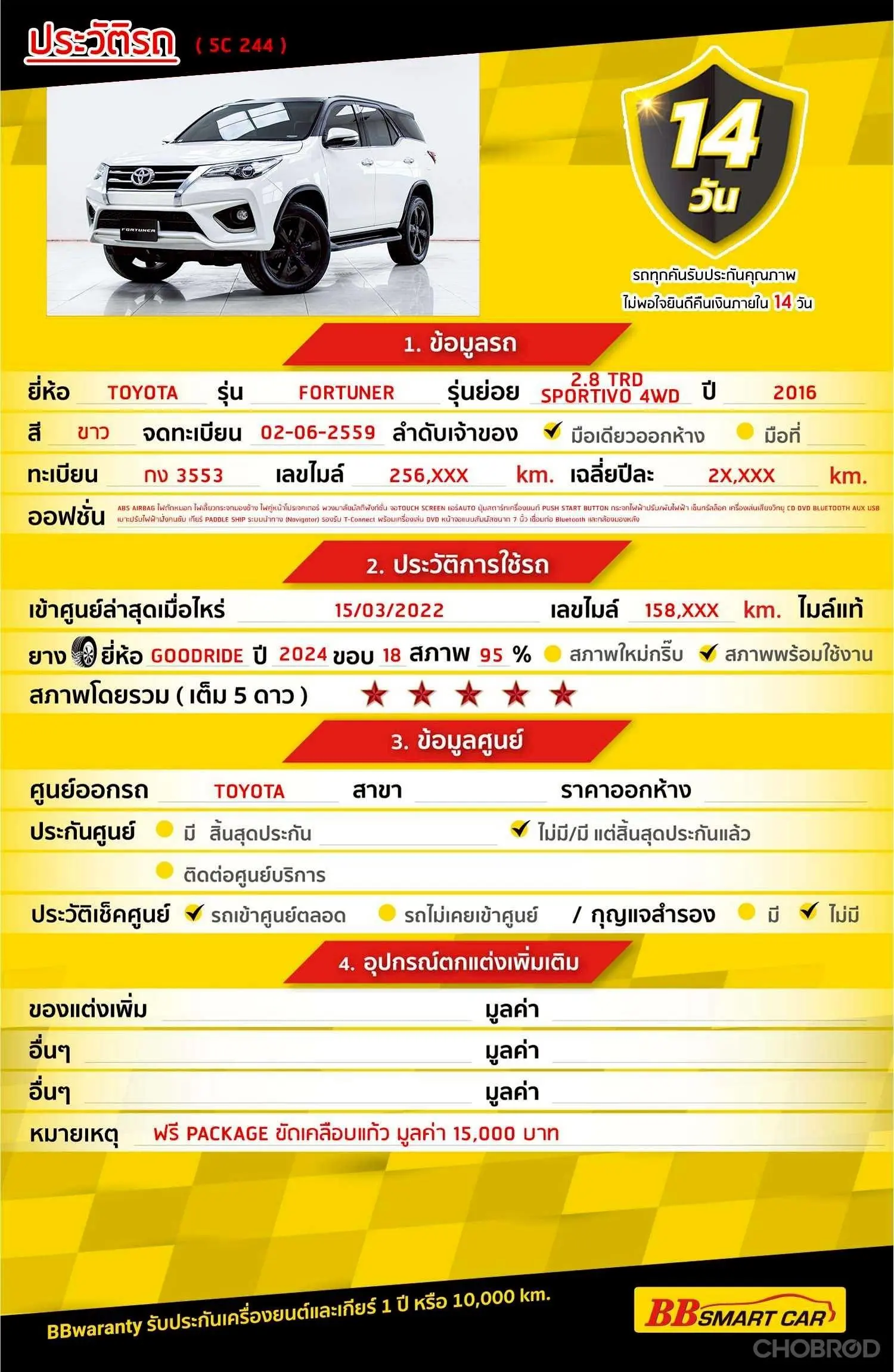 TOYOTA FORTUNER 2.8 TRD SPORTIVO 4WD AT 2016 ออกรถ 0 บาท จัดได้ 859,000 บ. Line:@BBCAR05 🔥จอง 199 บาท ส่งบัตรประชาชน รู้ผลพิจารณาภายใน 30 นาที ไม่ผ่านคืนเงินจองทุกกรณี 🔥ซื้อรถกับ BB พร้อมให้คำปรึกษา แก้ทุกปัญหา ให้ทุกเรื่อง บริการ call center 24 ชม. 🔥BB Care Plus รับประกันหลังการขาย สูงสุด 2 ปี หรือ 20,000 km. 🔥มีรถให้เลือกมากกว่า 1,800 คัน สาขา5 ถ.เศรษฐกิจ ใกล้โลตัสมหาชัย รหัสรถ 5C244 ราคา 839,000 บ. ผ่อนเพียง 15,273 บ. Brand. : TOYOTA Year. : 2016 Model. : FORTUNER Grade. : 2.8 TRD SPORTIVO 4WD Engine. : 2800 CC Type. : ดีเซล Gearbox. : A/T Color. : ขาว Mileage. : 256,xxx km. (ซื้อสด ราคานี้ยังไม่รวมค่าดำเนินการ 10,000 บ.) 🚩 Price 839,000 บาท ยอดจัด : 849,000 บาท เงินดาวน์. : 0 บาท ประกันภัย : ฟรีประกันภัย 1 ปี ค่าดำเนินการ : 10,000 บาท รวมออกรถ 0 บาท ผ่อน36= 28,180 บาท ผ่อน48 = 21,871 บาท ผ่อน60 = 18,237 บาท ผ่อน72 = 16,395 บาท ผ่อน84 = 15,273 บาท เงื่อนไขเป็นไปตามที่ไฟแนนซ์กำหนด** โปรโมชั่นพิเศษ สำหรับลูกค้าเครดิตดี 🚩เลือกรับเรทดอกเบี้ยพิเศษ 📍36 งวด = 1.29 % 📍48 งวด = 1.99 % 📍60 งวด = 2.39 % 📍72 งวด = 3.59 % 🔥เงื่อนไข โปรโมชั่น ดอกเบี้ยเริ่มต้น 1.29% ตลอดอายุสัญญา - ยอดจัดไฟแนนซ์ 300,000-600,0000 บาท - ผ่อนสูงสุด 72 เดือน - เป็นลูกค้าประวัติดี พนักงานประจำเงินเดือน 20,000 ขึ้นไป - ค่าดำเนินการแคมเปญ 20,000 บาท (รวมในยอดจัดได้) 🎗Car Hightlight. TOYOTA FORTUNER เครื่อง 2800 cc. รถยนต์เอนกประสงค์ นั่งสบายถึง 7 ที่นั่ง พร้อมเทคโนโลยีเพื่อความปลอดภัยและเป็นรถยนต์อเนกประสงค์ มาพร้อมเทคโนโลยีล้ำสมัย 🎗ภายใน. เบรค ABS กระจกไฟฟ้า วิทยุ - CD เบาะไฟฟ้าคนขับ ไมล์ Digital Airbag เซ็นทรัลล๊อก เกียร์ Paddle Shift แอร์ AUTO กระจกมองข้างปรับไฟฟ้า พวงมาลัย Multifunction จอ LCD เล่น DVD Navigator 🎗ภายนอก. ตัวรถสีขาว ไฟตัดหมอก ไฟเลี้ยวกระจกมองข้าง กระจกมองข้างพับไฟฟ้า แล็คหลังคา คิ้วกันสาด บันไดข้าง ไฟโปรเจคเตอร์ 🎗ความคุ้มค่า สำหรับคันนี้หากเปรียบเทียบราคากับคุณภาพ ถือว่าคุ้มค่ามากครับ ผ่อนสบายๆก็มีรถขับได้ รถดีมีคุณภาพแบบนี้รีบตัดสินใจซื้อได้เลย ราคานี้มาไวไปไวนะคะ ⭐️การรับประกันหลังการขาย BB Care Plus สูงสุด 2 ปี หรือ 20,000 km. ด้วยช่างที่ผ่านการอบรมจากศูนย์ชั้นนำของประเทศ 🎉Special offer เฉพาะ บีบีสมาร์ทคาร์ ที่นี่ที่เดียว ⭐ดอกเบี้ยเริ่มต้น 1.29% มีไฟแนนซ์รองรับหลายที่ค่ะ ⭐ฟรี!! แพคเก็จ ขัดเคลือบแก้ว มูลค่า 15,000 บาท ทุกคัน ⭐อนุมัติไว 30 นาที นำเอกสารมาให้ครบรับรถกลับบ้านทันทีค่ะ ⭐BB Care Plus รับประกันหลังการขาย สูงสุด 2 ปี หรือ 20,000 km. ⭐มี 6 สาขา ในกรุงเทพและปริมณฑลใกล้บ้านท่าน ⭐รถทุกคันผ่านตรวจสอบ Inspection เรียบร้อยแล้วค่ะ ผ่าน 5 ดาวทุกคันค่ะ ⭐เซลล์ทุกท่านเป็นมืออาชีพพร้อมให้บริการทุกท่านแน่นอนค่ะ