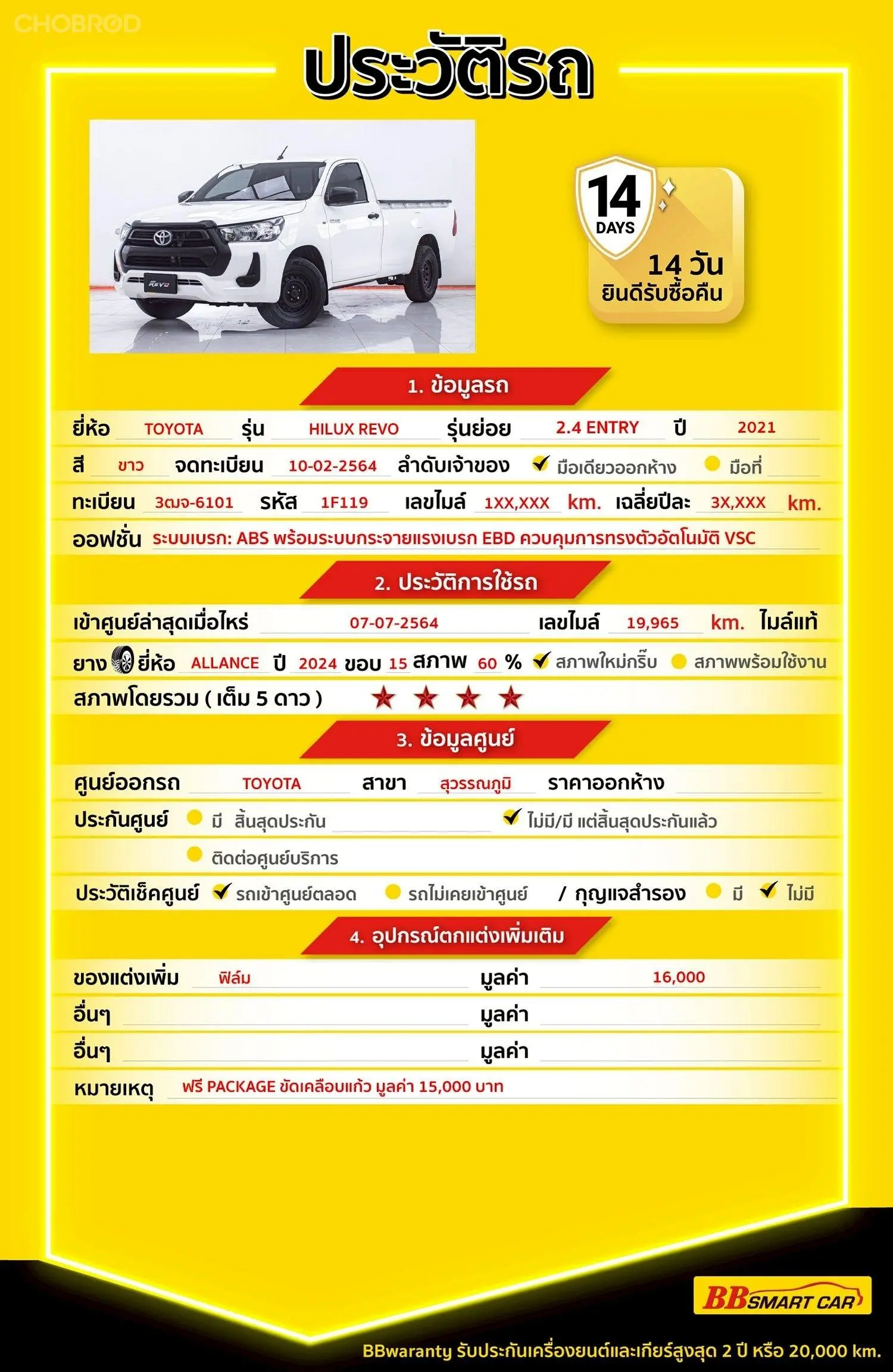 TOYOTA HILUX REVO 2.4 ENTRY STANDARD CAB AT 2021 ออกรถ 0 บาท จัดได้ ้ 419,000 บ. Line:@******แสดงข้อมูล 🔥มีรถให้เลือกมากกว่า 1,800 คัน 🔥รถทุกคันผ่านตรวจสอบ Inspection เรียบร้อยแล้วค่ะ ผ่าน 5 ดาวทุกคันค่ะ 🔥ซื้อรถกับ BB พร้อมให้คำปรึกษา แก้ทุกปัญหา ให้ทุกเรื่อง บริการ call center 24 ชม. 🔥BB Care Plus รับประกันหลังการขาย สูงสุด 2 ปี หรือ 20,000 km. 🔥ฟรี!! แพคเก็จ ขัดเคลือบแก้ว มูลค่า 15,000 บาท ทุกคัน 🔥มี 6 สาขา ในกรุงเทพและปริมณฑลใกล้บ้านท่าน สาขา 1 สี่แยกมไหสวรรย์ ใกล้เดอะมอลล์ท่าพระ รหัสรถ 1F119 ราคา 399,000 บาท ผ่อนเพียง 7,139 บาท Brand. : TOYOTA Year. : 2021 Model. : HILUX REVO Grade. : 2.4 ENTRY STANDARD CAB Engine. : 2400 CC Type. : ดีเซล Gearbox : AT Color. : ขาว Mileage. : 171,XXX KM. (ซื้อสด ราคานี้ยังไม่รวมค่าดำเนินการ 10,000 บ.) 🚩 Price. 399,000 บาท ยอดจัด : 409,000 บาท เงินดาวน์ : 0 บาท ประกันภัย : ค่าดำเนินการ : 10,000 บาท รวมออกรถ : 0 บาท ผ่อน 36 งวด =13,502 บาท ผ่อน 48 งวด =10,464 บาท ผ่อน 60 งวด = 8,713 บาท ผ่อน 72 งวด = 7,825 บาท ผ่อน 84 งวด = 7,139 บาท เงื่อนไขเป็นไปตามที่ไฟแนนซ์กำหนด โปรโมชั่นพิเศษ สำหรับลูกค้าเครดิตดีลือกรับเรทดอกเบี้ยพิเศษ 📍36 งวด = 2.59 % 📍48 งวด = 2.89 % 📍60 งวด = 3.29 % 📍72 งวด = 4.49 % 🔥 เงื่อนไข โปรโมชั่น ดอกเบี้ยเริ่มต้น 2.59% ตลอดอายุสัญญา - ยอดจัดไฟแนนซ์ 300,000-600,000 บาท - ผ่อนสูงสุด 72 เดือน - เป็นลูกค้าประวัติดี - ค่าดำเนินการแคมเปญ 20,000 บาท (รวมในยอดจัดได้) 🎗Car Hightlight รถสวยๆ วันนี้ขอแนะนำ TOYOTA HILUX REVO 2.4 ENTRY STANDARD CAB AT 2021 จุดเด่นออฟชั่น 1 : เครื่องยนต์: 2GD-FTV (High) ดีเซล 4 สูบ แถวเรียง 16 วาล์ว DOHC VN Turbo และ Intercooler ความจุ: 2,393 ซีซี 2 : พละกำลังสูงสุด: 150 แรงม้า (110 กิโลวัตต์) ที่ 3,400 รอบ/นาที แรงบิดสูงสุด: 400 นิวตันเมตร ที่ 1,600 - 2,000 รอบ/นาที 3 : เกียร์: อัตโนมัติ 6 จังหวะ พร้อม Sequential Shift ระบบขับเคลื่อน: ขับเคลื่อน 2 ล้อหลัง (2WD) 🎗ภายใน * ระบบกันสะเทือนหน้า อิสระปีกนกคู่ พร้อม คอยล์สปริงและเหล็กกันโคลง * ระบบกันสะเทือนหลัง: แหนบซ้อน * เบรกหน้า: ดิสก์เบรกแบบมีครีบระบายความร้อน * เบรกหลัง: ดรัมเบรก * เบาะคนขับ: ปรับธรรมดา ระดับสูง-ต่ำได้ * เครื่องเสียง: หน้าจอสัมผัสขนาด 8 นิ้ว รองรับ Bluetooth / Apple CarPlay / Android Auto / T-Connect * ระบบเบรก: ABS พร้อมระบบกระจายแรงเบรก EBD 🎗ภายนอก * ล้อ: กระทะเหล็ก 15 นิ้ว พร้อมฝาครอบดุมล้อ * ไฟหน้า: ฮาโลเจน มัลติรีเฟล็กเตอร์ * ไฟ Daytime Running Lights (LED)
