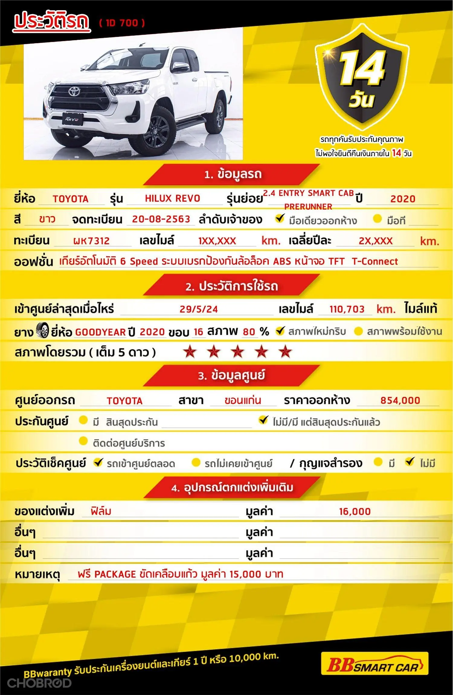 TOYOTA HILUX REVO 2.4 ENTRY SMART CAB PRERUNNER AT 2020 ออกรถ 0 บาท จัดได้ 504,000 บ. Line:***********แสดงข้อมูล 🔥จอง 199 บาท ส่งบัตรประชาชน รู้ผลพิจารณาภายใน 30 นาที ไม่ผ่านคืนเงินจองทุกกรณี 🔥ซื้อรถกับ BB พร้อมให้คำปรึกษา แก้ทุกปัญหา ให้ทุกเรื่อง บริการ call center 24 ชม. 🔥BB Care Plus รับประกันหลังการขาย สูงสุด 2 ปี หรือ 20,000 km.. 🔥มีรถให้เลือกมากกว่า 1,600 คัน สาขา 1 สี่แยกมไหสวรรย์ ใกล้เดอะมอลล์ท่าพระ รหัสรถ 1D700 ราคา 484,000 บาท ผ่อนเพียง 8,623 บาท Brand. : TOYOTA Year. : 2020 Model. : HILUX REVO Grade. : 2.4 ENTRY SMART CAB PRERUNNER Engine. : 2400 CC Type. : ดีเซล Gearbox : AT Color. : ขาว Mileage. : 120,XXX KM. (ซื้อสด ราคานี้ยังไม่รวมค่าดำเนินการ 10,000 บ.) 🚩 Price. 484,000 บาท ยอดจัด : 494,000 บาท เงินดาวน์ : 0 บาท ประกันภัย : ฟรีประกันภัย 1 ปี ค่าดำเนินการ : 10,000 บาท รวมออกรถ : 0 บาท ผ่อน 36 งวด = 16,308 บาท ผ่อน 48 งวด = 12,638 บาท ผ่อน 60 งวด = 10,523 บาท ผ่อน 72 งวด = 9,451 บาท ผ่อน 84 งวด = 8,623 บาท เงื่อนไขเป็นไปตามที่ไฟแนนซ์กำหนด โปรโมชั่นพิเศษ สำหรับลูกค้าเครดิตดีลือกรับเรทดอกเบี้ยพิเศษ 📍36 งวด = 2.59 % 📍48 งวด = 2.89 % 📍60 งวด = 3.29 % 📍72 งวด = 4.49 % 🔥 เงื่อนไข โปรโมชั่น ดอกเบี้ยเริ่มต้น 2.59% ตลอดอายุสัญญา - ยอดจัดไฟแนนซ์ 300,000-600,000 บาท - ผ่อนสูงสุด 72 เดือน - เป็นลูกค้าประวัติดี - ค่าดำเนินการแคมเปญ 20,000 บาท (รวมในยอดจัดได้) 🎗Car Hightlight รถสวยๆ วันนี้ขอแนะนำ TOYOTA HILUX REVO 2.4 ENTRY SMART CAB PRERUNNER AT 2020 จุดเด่นออฟชั่น 1 : เกียร์อัตโนมัติ 6 Speed 2 : หน้าจอ TFT T-Connect แสดงข้อมูลการขับขี่ ระบบเชื่อมต่อ Bluetooth และ USB 🎗ภายใน ระบบเบรกป้องกันล้อล็อค ABS ระบบกระจายแรงเบรก EBD ระบบเสริมแรงเบรก BA ระบบควบคุมการทรงตัว VSC ระบบป้องกันล้อหมุนฟรี TRC ระบบช่วยการออกตัวบนทางลาดชัน HAC ถุงลมนิรภัย 7 ตำแหน่ง (คู่หน้า-ด้านข้าง-ม่านนิรภัย-หัวเข่าคนขับ) 🎗ภายนอก ไฟหน้าดีไซน์ใหม่แบบ Bi-Beam ไฟ LED Daytime Running Light ไฟท้ายแบบ LED Light Guiding ล้อแมกซ์ 16 นิ้ว 🎗ความคุ้มค่า สำหรับคันนี้หากเปรียบเทียบราคากับคุณภาพ คันนี้ถือว่าคุ้มค่ามากค่ะ ผ่อนสบายๆก็มีรถขับได้ รถดีมีคุณภาพแบบนี้รีบตัดสินใจซื้อได้เลราคานี้มาไวไปไวนะคะ ⭐️การรับประกันหลังการขาย BB Care Plus สูงสุด 2 ปี หรือ 20,000 km. ด้วยช่างที่ผ่านการอบรมจากศูนย์ชั้นนำของประเทศ 🎉Special offer เฉพาะ บีบีสมาร์ทคาร์ ที่นี่ที่เดียว ⭐ดอกเบี้ยเริ่มต้น 2.59% มีไฟแนนซ์รองรับหลายที่ค่ะ ⭐ฟรี!! แพคเก็จ ขัดเคลือบแก้ว มูลค่า 15,000 บาท ทุกคัน ⭐อนุมัติไว 30 นาที นำเอกสารมาให้ครบรับรถกลับบ้านทันทีค่ะ ⭐BB Care Plus รับประกันหลังการขาย สูงสุด 2 ปี หรือ 20,000 km. ⭐มี 6 สาขา ในกรุงเทพและปริมณฑลใกล้บ้านท่าน ⭐รถทุกคันผ่านตรวจสอบ Inspection เรียบร้อยแล้วค่ะ ผ่าน 5 ดาวทุกคันค่ะ ⭐เซลล์ทุกท่านเป็นมืออาชีพพร้อมให้บริการทุกท่านแน่นอนค่ะ เลือกข้อเสนอที่ให้คุณมากกว่าที่อื่น เพราะเราเล็งเห็นแล้ว ที่บีบีสมาร์ทคาร์ ให้คุณได้มากกว่าที่อื่นแน่น