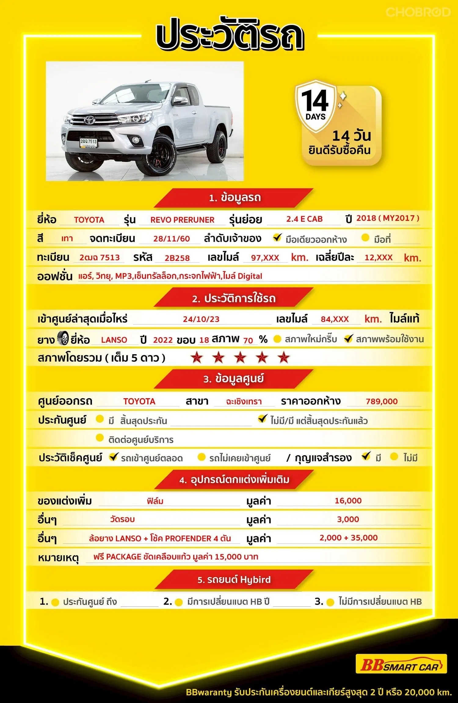 TOYOTA REVO 2.4 E PLUS PRERUNNER SMART CAB MT 2018 ออกรถ 0 บาท จัดได้ 409,000 บ. Line : @*******แสดงข้อมูล 🔥จอง 199 บาท ส่งบัตรประชาชน รู้ผลพิจารณาภายใน 30 นาที ไม่ผ่านคืนเงินจองทุกกรณี 🔥ซื้อรถกับ BB พร้อมให้คำปรึกษา แก้ทุกปัญหา ให้ทุกเรื่อง บริการ call center 24 ชม. 🔥BB Care Plus รับประกันหลังการขาย สูงสุด 2 ปี หรือ 20,000 km. 🔥มีรถให้เลือกมากกว่า 1,800 คัน สาขา2 สี่แยกแครายใกล้เดอะมอลล์งามวงศ์วาน รหัสรถ 2B258 ราคา 389,000 บ. ผ่อนเพียง 6,965 บ. Brand. : TOYOTA Year. : 2018 Model. : REVO Grade. : 2.4 E PLUS PRERUNNER SMART CAB Engine. : 2400 Type. : ดีเซล Gearbox. : MT Color. : เทา Mileage. : 97,200 km. (ซื้อสด ราคานี้ยังไม่รวมค่าดำเนินการ 10,000 บ.) 🚩 Price. 389,000 บาท ยอดจัด : 399,000 บาท เงินดาวน์. : 0 บาท ประกันภัย : ฟรีประกันภัย 1 ปี ค่าดำเนินการ : 10,000 บาท รวมออกรถ 0 บาท ผ่อน36 = 13,172 บาท ผ่อน48 = 10,207 บาท ผ่อน60 = 8,499 บาท ผ่อน72 = 7,633 บาท ผ่อน84 = 6,965 บาท **เงื่อนไขเป็นไปตามที่ไฟแนนซ์กำหนด** โปรโมชั่นพิเศษ สำหรับลูกค้าเครดิตดี 🚩รับเรทดอกเบี้ยพิเศษ 📍36 งวด = 2.59 % 📍48 งวด = 2.89 % 📍60 งวด = 3.29 % 📍72 งวด = 4.49 % 🔥 เงื่อนไข โปรโมชั่น ดอกเบี้ยเริ่มต้น 2.59% ตลอดอายุสัญญา - ยอดจัดไฟแนนซ์ 300,000-600,0000 บาท - ผ่อนสูงสุด 72 เดือน - เป็นลูกค้าประวัติดี พนักงานประจำเงินเดือน 20,000 ขึ้นไป - ค่าดำเนินการแคมเปญ 20,000 บาท (รวมในยอดจัดได้) 🎗Car Hightlight รถกระบะใช้งาน ยอดนิยมตลอดกาล กับสมรรธนะที่ยอดเยี่ยม ดีไซน์ก็ทันสมัย ใครๆก็อยากได้เป็นเจ้าของ 🎗ภายใน. กระจกมองข้างปรับไฟฟ้า เบรค ABS เบาะกำมะหยี่ พวงมาลัย Multifunction เซ็นทรัลล๊อก กระจกไฟฟ้า แอร์ วิทยุ - CD ไมล์ Digital Airbag 🎗ภายนอก. กระจังหน้าโครเมียม ไฟเลี้ยวกระจกมองข้าง กระจกมองข้างพับไฟฟ้า ไฟตัดหมอก ล้อแม็ก 🎗ความคุ้มค่า. ด้วยรูปลักษณ์ภายนอก ภายใน ที่ดูล้ำสมัย แถมยังมาพร้อมกับเทคโนโลยีใหม่ๆ หลายรายการ มันจึงเป็นรถที่เรียกเสียงฮือฮาในโลกออนไลน์ได้เป็นอย่างมาก ⭐️การรับประกันหลังการขาย BB Care Plus สูงสุด 2 ปี หรือ 20,000 km. ด้วยช่างที่ผ่านการอบรมจากศูนย์ชั้นนำของประเทศ 🎉Special offer เฉพาะ บีบีสมาร์ทคาร์ ที่นี่ที่เดียว ⭐ดอกเบี้ยเริ่มต้น 2.59% มีไฟแนนซ์รองรับหลายที่ค่ะ ⭐ฟรี!! แพคเก็จ ขัดเคลือบแก้ว มูลค่า 15,000 บาท ทุกคัน ⭐อนุมัติไว 30 นาที นำเอกสารมาให้ครบรับรถกลับบ้านทันทีค่ะ ⭐BB Care Plus รับประกันหลังการขาย สูงสุด 2 ปี หรือ 20,000 km. ⭐มี 6 สาขา ในกรุงเทพและปริมณฑลใกล้บ้านท่าน ⭐รถทุกคันผ่านตรวจสอบ Inspection เรียบร้อยแล้วค่ะ ผ่าน 5 ดาวทุกคันค่ะ ⭐เซลล์ทุกท่านเป็นมืออาชีพพร้อมให้บริการทุกท่านแน่นอนค่ะ เลือกข้อเสนอที่ให้คุณมากกว่าที่อื่น เพราะเราเล็งเห็นแล้ว ที่บีบีสมาร์ทคาร์ ให้คุณได้มากกว่าที่อื่นแน่นอนครับ มาที่เดียวจบทุกปัญหา หลากหลายรุ่นให้เลือกกับบริการที่คุณต้องประทับใจแน่นอนครับ