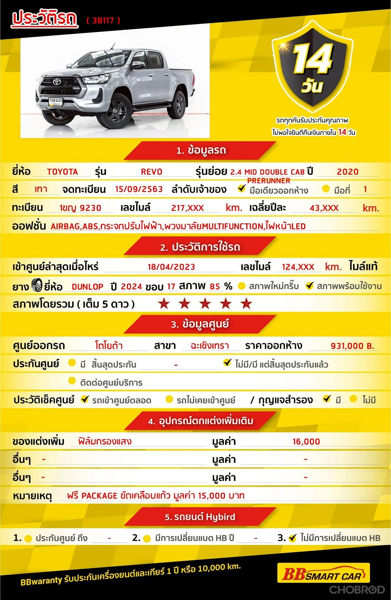 TOYOTA REVO 2.4 MID PRERUNNER 4DR MT 2020 ออกรถ 0 บาท จัดได้ 584,000 บ. Line:@*******แสดงข้อมูล 🔥 จอง 199 บาท ส่งบัตรประชาชน รู้ผลอนุมัติภายใน 30 นาที ไม่ผ่านคืนเงินจองทุกกรณี 🔥 ซื้อรถกับ BB พร้อมให้คำปรึกษา แก้ทุกปัญหา ให้ทุกเรื่อง บริการ call center 24 ชม. 🔥 BB Care Plus รับประกันหลังการขาย สูงสุด 2 ปี หรือ 20,000 km. 🔥 มีรถให้เลือกมากกว่า 1,800 คัน สาขา 3 ถนนกาญจนาภิเษก ใกล้โลตัสบางใหญ่ รหัสรถ 3B117 ราคา 564,000 บ. ผ่อนเพียง 9,693 บ. Brand : TOYOTA Year : 2020 Model : REVO Grade : 2.4 MID PRERUNNER 4DR Engine : 2400 cc. Type : ดีเซล Gearbox : M/T Color : เทา Mileage : 217,XXX km. (ซื้อสด ราคานี้ยังไม่รวมค่าดำเนินการ 10,000 บ.) 🚩 Price 564,000 บาท ยอดจัด : 574,000 บาท เงินดาวน์ : ฟรีเงินดาวน์ ประกันภัย : ฟรีประกันภัย 1 ปี ค่าดำเนินการ : 10,000 บาท รวมออกรถ : 0 บาท ผ่อน 36 = 18,650 บาท ผ่อน 48 = 14,348 บาท ผ่อน 60 = 11,921 บาท ผ่อน 72 = 10,665 บาท ผ่อน 84 = 9,693 บาท *เงื่อนไขเป็นไปตามที่ไฟแนนซ์กำหนด โปรโมชั่นพิเศษ สำหรับลูกค้าเครดิตดี 🚩เลือกรับเรทดอกเบี้ยพิเศษ 📍36 งวด = 1.29% 📍48 งวด = 1.99% 📍60 งวด = 2.39% 📍72 งวด = 3.59% 🔥 เงื่อนไข โปรโมชั่น ดอกเบี้ยเริ่มต้น 1.29% ตลอดอายุสัญญา - ยอดจัดไฟแนนซ์ 300,000-600,0000 บาท - ผ่อนสูงสุด 72 เดือน - เป็นลูกค้าประวัติดี พนักงานประจำ เงินเดือน 20,000 บาท ขึ้นไป - ค่าดำเนินการแคมเปญ 20,000 บาท (รวมในยอดจัดได้) 🎗Car Hightlight รถสวยๆ วันนี้ขอแนะนำ TOYOTA REVO มีพละกำลังเครื่องยนต์ที่ใช้ได้อย่างเหลือเฟือ ลุยได้ทุกสถานการณ์ แถมออปชั่นภายในครบเครื่อง ช่วงล่างนุ่มนวลดูดซับแรงสะเทือนได้ดีมาก ใช้งานได้ง่ายสะดวกสบายสุดๆเลยค่ะ 🎗ภายใน ภายในสะอาดเรียบร้อย มาพร้อมกับ พวงมาลัยเพาเวอร์ กระจกมองข้างปรับไฟฟ้า Airbag เซ็นทรัลล๊อก วิทยุ - CD พวงมาลัย Multifunction เบรค ABS ไมล์ Digital เบาะผ้า จอ LCD เล่น DVD แอร์ กุญแจรีโมท-สัญญานกันขโมย อ๊อฟชั่นครบคันเลยค่ะ สภาพใหม่มากค่ะ 🎗ภายนอก TOYOTA REVO คันนี้ ภายนอกเป็นสีเทา พร้อมบรรทุกเต็มพิกัด และมีอัตราเร่งที่น่าประทับใจ ตัวเครื่องเดิมจากศูนย์ รูปทรงรถดูสมาร์ทมาก กระจกไฟฟ้า บันไดข้าง กระจกข้างโครเมี่ยม ไฟเลี้ยวกระจกมองข้าง ไฟซีนอน แม็กลายเนอร์ กระจกมองข้างพับไฟฟ้า 🎗ความคุ้มค่า รถสภาพนี้หายากมากค่ะบอกเลย รถไมล์แท้อีกด้วย คัดเลือกคันนี้มาแล้วค่ะสภาพดีมากๆ เทียบกับราคานี้ถือว่าคุ้มค่ามากๆค่ะ มาดูรถไม่ผิดหวังแน่นนอนค่ะ ⭐การรับประกันหลังการขาย BB Care Plus สูงสุด 2 ปี หรือ 20,000 km. ด้วยช่างที่ผ่านการอบรมจากศูนย์ชั้นนำของประเทศ 🎉Special offer เฉพาะ บีบีสมาร์ทคาร์ ที่นี่ที่เดียว ⭐ดอกเบี้ยเริ่มต้น 1.29% มีไฟแนนซ์รองรับหลายที่ค่ะ ⭐ฟรี!! แพคเก็จ ขัดเคลือบแก้ว มูลค่า 15,000 บาท ทุกคัน ⭐อนุมัติไว 30 นาที นำเอกสารมาให้ครบรับรถกลับบ้านทันทีค่ะ ⭐BB Care Plus รับประกันหลังการขาย สูงสุด 2 ปี หรือ 20,000 km. ⭐มี 6 สาขา ในกรุงเทพและปริมณฑลใกล้บ้านท่