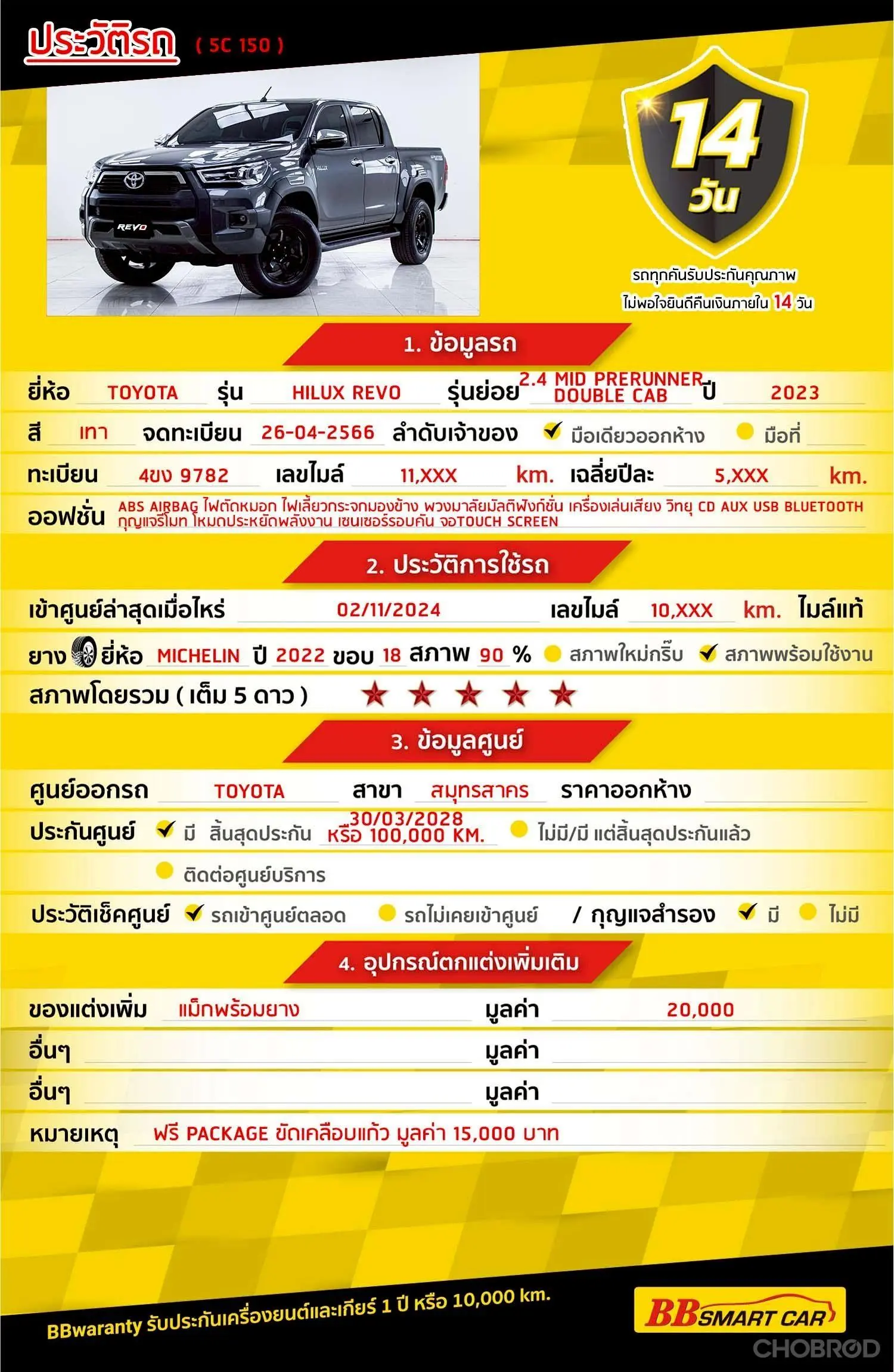 TOYOTA HILUXREVO 2.4 MID DOUBLE CAB PRERUNNER MT 2023 ออกรถ 0 บาท จัดได้ 699,000 บ. Line:@*******แสดงข้อมูล 🔥จอง 199 บาท ส่งบัตรประชาชน รู้ผลพิจารณาภายใน 30 นาที ไม่ผ่านคืนเงินจองทุกกรณี 🔥ซื้อรถกับ BB พร้อมให้คำปรึกษา แก้ทุกปัญหา ให้ทุกเรื่อง บริการ call center 24 ชม. 🔥BB Care Plus รับประกันหลังการขาย สูงสุด 2 ปี หรือ 20,000 km. 🔥มีรถให้เลือกมากกว่า 1,600 คัน สาขา5 ถ.เศรษฐกิจ ใกล้โลตัสมหาชัย รหัสรถ 5C150 ราคา 679,000 บาท ผ่อนเพียง 11,703 บาท Brand. : TOYOTA Year. : 2023 Model. : HILUX REVO Grade. : 2.4 MID DOUBLE CAB PRERUNNER Engine. : 2400 CC Type. : ดีเซล Gearbox : M/T Color. : เทา Mileage. : 11,XXX KM (ซื้อสด ราคานี้ยังไม่รวมค่าดำเนินการ 10,000 บ.) 🚩 Price. 679,000 บาท ยอดจัด : 689,000 บาท เงินดาวน์ : 0 บาท ประกันภัย : ฟรีประกันภัย 1 ปี ค่าดำเนินการ : 10,000 บาท รวมออกรถ : 0 บาท ผ่อน 36 งวด = 22,515 บาท ผ่อน 48 งวด = 17,321 บาท ผ่อน 60 งวด = 14,392 บาท ผ่อน 72 งวด = 12,875 บาท ผ่อน 84 งวด = 11,703 บาท เงื่อนไขเป็นไปตามที่ไฟแนนซ์กำหนด** โปรโมชั่นพิเศษ สำหรับลูกค้าเครดิตดีลือกรับเรทดอกเบี้ยพิเศษ 📍36 งวด = 1.29 % 📍48 งวด = 1.99 % 📍60 งวด = 2.39 % 📍72 งวด = 3.59 % 🔥เงื่อนไข โปรโมชั่น ดอกเบี้ยเริ่มต้น 1.29% ตลอดอายุสัญญา - ยอดจัดไฟแนนซ์ 300,000-600,000 บาท - ผ่อนสูงสุด 72 เดือน - เป็นลูกค้าประวัติดี พนักงานประจำเงินเดือน 20,000 ขึ้นไป - ค่าดำเนินการแคมเปญ 20,000 บาท (รวมในยอดจัดได้) 🎗Car Hightlight TOYOTA HILUX REVO 2.4 MID DOUBLE CAB PRERUNNER MT ดีเซล จุดเด่นออฟชั่น 1. พวงมาลัย Multifunction 2. เซนเซอร์ถอยหลัง เซนเซอร์รอบคัน 3. กระจกมองข้างปรับไฟฟ้า 🎗ภายใน จอ LCD เล่น DVD Airbag เบาะหนัง เซ็นทรัลล๊อก เบาะไฟฟ้าคนขับ กระจกไฟฟ้า แอร์ พวงมาลัย Multifunction วิทยุ - CD เบรค ABS กุญแจรีโมท-สัญญานกันขโมย Navigator 🎗ภายนอก ตัวรถสีเทา มาพร้อม กระจกมองข้างปรับไฟฟ้า ไฟเลี้ยวกระจกมองข้าง เซนเซอร์รอบคัน บันไดข้าง กระจกข้างโครเมี่ยม เซนเซอร์ถอยหลัง ล้อแม็ก ไฟตัดหมอก ไฟโปรเจคเตอร์ กระจกมองข้างพับไฟฟ้า 🎗ความคุ้มค่า สำหรับคันนี้หากเปรียบเทียบราคากับคุณภาพ คันนี้ถือว่าคุ้มค่ามากค่ะ ผ่อนสบายๆก็มีรถขับได้ รถดีมีคุณภาพแบบนี้รีบตัดสินใจซื้อได้เลราคานี้มาไวไปไวนะคะ ⭐️การรับประกันหลังการขาย BB Care Plus สูงสุด 2 ปี หรือ 20,000 km. ด้วยช่างที่ผ่านการอบรมจากศูนย์ชั้นนำของประเทศ 🎉Special offer เฉพาะ บีบีสมาร์ทคาร์ ที่นี่ที่เดียว ⭐ดอกเบี้ยเริ่มต้น 1.29 % มีไฟแนนซ์รองรับหลายที่ค่ะ ⭐ฟรี!! แพคเก็จ ขัดเคลือบแก้ว มูลค่า 15,000 บาท ทุกคัน ⭐อนุมัติไว 30 นาที นำเอกสารมาให้ครบรับรถกลับบ้านทันทีค่ะ ⭐BB Care Plus รับประกันหลังการขาย สูงสุด 2 ปี หรือ 20,000 km. ⭐มี 6 สาขา ในกรุงเทพและปริมณฑลใกล้บ้านท่าน ⭐รถทุกคันผ่านตรวจสอบ Inspection เรียบร้อยแล้วค่ะ ผ่าน 5 ดาวทุกคันค่ะ ⭐เซลล์ทุกท่านเป็นมืออาชีพพร้อมให้บริการทุกท่านแน่นอนค่ะ
