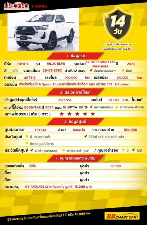 มีการรับประกันจากดีลเลอร์ (6 เดือน) มีบริการช่วยเหลือฉุกเฉินบนท้องถนน 24 ชม. จากดีลเลอร์