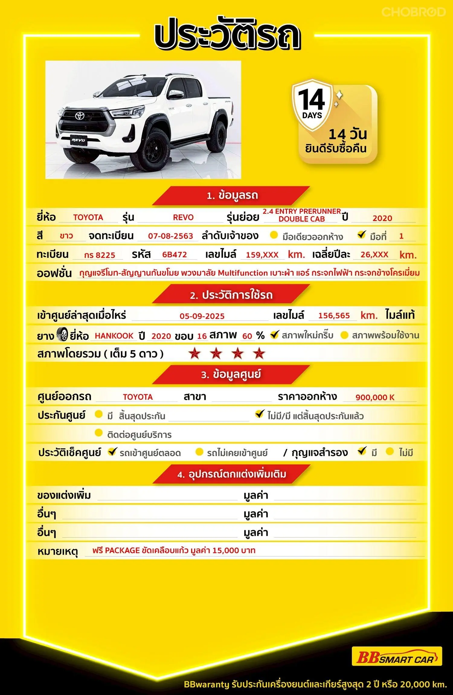 มีการรับประกันจากดีลเลอร์ (6 เดือน) มีบริการช่วยเหลือฉุกเฉินบนท้องถนน 24 ชม. จากดีลเลอร์