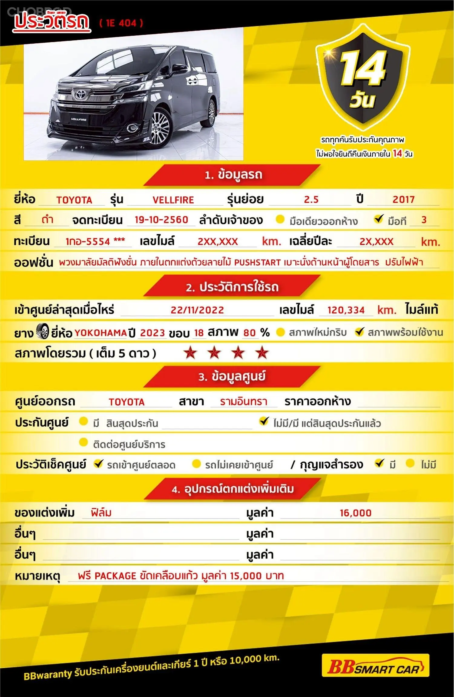 TOYOTA VELLFIRE 2.5 AT 2017 ออกรถ 0 บาท จัดได้ 1,019,000 บ. Line:@**********แสดงข้อมูล 🔥จอง 199 บาท ส่งบัตรประชาชน รู้ผลพิจารณาภายใน 30 นาที ไม่ผ่านคืนเงินจองทุกกรณี 🔥ซื้อรถกับ BB พร้อมให้คำปรึกษา แก้ทุกปัญหา ให้ทุกเรื่อง บริการ call center 24 ชม. 🔥BB Care Plus รับประกันหลังการขาย สูงสุด 2 ปี หรือ 20,000 km.. 🔥มีรถให้เลือกมากกว่า 1,800 คัน สาขา 1 สี่แยกมไหสวรรย์ ใกล้เดอะมอลล์ท่าพระ รหัสรถ 1E404 ราคา 999,000 บาท ผ่อนเพียง 18,151 บาท Brand. : TOYOTA Year. : 2017 Model. : VELLFIRE Grade. : 2.5 Engine. : 2500 CC Type. : เบนซิน+LPG Gearbox : AT Color. : ดำ Mileage. : 206,XXX KM. (ซื้อสด ราคานี้ยังไม่รวมค่าดำเนินการ 10,000 บ.) 🚩 Price. 999,000 บาท ยอดจัด : 1,009,000 บาท เงินดาวน์ : 0 บาท ประกันภัย : ฟรีประกันภัย 1 ปี ค่าดำเนินการ : 10,000 บาท รวมออกรถ : 0 บาท ผ่อน 36 งวด = 33,490 บาท ผ่อน 48 งวด = 25,992 บาท ผ่อน 60 งวด = 21,674 บาท ผ่อน 72 งวด = 19,485 บาท ผ่อน 84 งวด = 18,151 บาท เงื่อนไขเป็นไปตามที่ไฟแนนซ์กำหนด โปรโมชั่นพิเศษ สำหรับลูกค้าเครดิตดีลือกรับเรทดอกเบี้ยพิเศษ 📍36 งวด = 1.29 % 📍48 งวด = 1.99 % 📍60 งวด = 2.39 % 📍72 งวด = 3.59 % 🔥 เงื่อนไข โปรโมชั่น ดอกเบี้ยเริ่มต้น 1.29% ตลอดอายุสัญญา - ยอดจัดไฟแนนซ์ 300,000-600,000 บาท - ผ่อนสูงสุด 72 เดือน - เป็นลูกค้าประวัติดี พนักงานประจำเงินเดือน 20,000 ขึ้นไป - ค่าดำเนินการแคมเปญ 20,000 บาท (รวมในยอดจัดได้) 🎗Car Hightlight รถสวยๆ วันนี้ขอแนะนำ TOYOTA VELLFIRE 2.5 AT 2017 จุดเด่นออฟชั่น 1 : ภายในตกแต่งด้วยลายไม้ 2 : พวงมาลัยมัลติฟังชั่น 3 : PUSHSTART 🎗ภายใน มาตรวัดความเร็วแบบ Optitron ระบบไฟหน้า ปรับระดับสูง – ต่ำ อัตโนมัติ ป้ายติดกระจกบังลมหลัง ” Officially Authorized by Toyota Motor Thailand ” สำหรับรุ่นปกติ ป้ายติดกระจกบังลมหลัง ” 10-Year Hybrid Battery Guarantee ” สำหรับรุ่น Hybrid ไฟอ่านหนังสือ สำหรับเบาะนั่งแถวที่ 2 เบาะนั่งหุ้มด้วยหนังแบบพิเศษ Perforated (Premium Nappa) เบาะนั่งคู่หน้า พร้อมระบบระบายอากาศ Heat & Ventilate Seat เบาะนั่งคู่หน้า พร้อมระบบบริหารหลังไฟฟ้า Air Lumbar Pro เบาะนั่งด้านหน้าผู้โดยสาร ปรับไฟฟ้า 4 ทิศทาง พร้อมที่รองขา เบาะนั่งด้านหน้า ผู้ขับขี่ ปรับไฟฟ้า 8 ทิศทาง เบาะนั่งด้านหน้า ผู้ขับขี่ พร้อมระบบความจำ 3 ตำแหน่ง เบาะนั่งแถวที่ 2 ปรับไฟฟ้า 2 ที่นั่ง แบบ Executive Lounge เบาะนั่งแถวที่ 2 พร้อมระบบความจำ 2 ตำแหน่ง เบาะนั่งแถวที่ 2 พร้อม Seat Ventilator & Heater ที่รองขา เบาะนั่งแถวที่ 2 พร้อมโต๊ะส่วนตัวแบบพับได้ ม่านบังแดด หน้าต่างหลัง แบบปรับธรรมดา ไฟส่องสว่างบริเวณที่เก็บสัมภาระด้านท้าย วัสดุหุ้มเสา หุ้มด้วยผ้าสักหลาด กล่องรับสัญญาณ Digital TV 🎗ภายนอก ไฟหน้า Projector Lens แบบ LED ไฟ Daytime Running Lights แบบ LED ไฟเลี้ยวหน้า – หลัง LED แบบจังหวะ Sequential ไฟตัดหมอก ไฟท้ายแบบ LED ไฟตัดหมอกด้านหลัง 🎗ความคุ้มค่า สำหรับคันนี้หากเปรียบเทียบราคากับคุณภาพ คันนี้ถือว่าคุ้มค่ามากค่ะ ผ่อนสบายๆก็มีรถขับได้ รถดีมีคุณภาพแบบนี้รีบตัดสินใจซื้อได้เลราคานี้มาไวไป