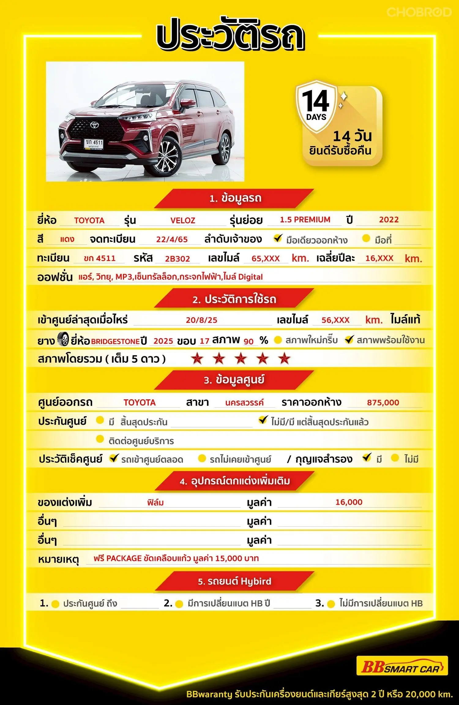 TOYOTA VELOZ 1.5 PREMIUM AT 2022 ออกรถ 0 บาท รหัสรถ 2B302 Line ID : @bbcar02 🔥มีรถให้เลือกมากกว่า 1,800 คัน 🔥รถทุกคันผ่านตรวจสอบ Inspection เรียบแล้วค่ะ ผ่าน 5 ดาวทุกคันค่ะ 🔥ซื้อรถกับ BB พร้อมให้คำปรึกษา แก้ทุกปัญหา ให้ทุกเรื่อง บริการ call center 24 ชม. 🔥BB Care Plus รับประกันหลังการขาย สูงสุด 2 ปี หรือ 20,000 km. 🔥ฟรี!! แพคเก็จ ขัดเคลือบแก้ว มูลค่า 15,000 บาท ทุกคัน 🔥มี 6 สาขา ในกรุงเทพและปริมณฑลใกล้บ้านท่าน บีบีสมาร์ทคาร์ 2 สาขาแคราย รหัสรถ 2B302 ราคา 549,000 บ. ผ่อนเพียง 9,358 บ. Brand : TOYOTA Year : 2022 Model : VELOZ Grade : 1.5 PREMIUM Engine : 1500 CC. Type : เบนซิน Gearbox : AT Color : แดง Mileage : 65,500 km. (ซื้อสด ราคานี้ยังไม่รวมค่าดำเนินการ 10,000 บ.) 🚩 Price. 549,000 บาท ยอดจัด : 559,000 บาท เงินดาวน์. : ฟรีเงินดาวน์ ประกันภัย : ฟรีประกันภัย 1 ปี ค่าดำเนินการ : 10,000 บาท รวมออกรถ 0 บาท ผ่อน36 งวด = 18,005 บาท ผ่อน48 งวด = 13,852 บาท ผ่อน60 งวด = 11,509 บาท ผ่อน72 งวด = 10,297 บาท ผ่อน84 งวด = 9,358 บาท **เงื่อนไขเป็นไปตามที่ไฟแนนซ์กำหนด โปรโมชั่นพิเศษ สำหรับลูกค้าเครดิตดี 🚩เลือกรับเรทดอกเบี้ยพิเศษ 📍36 งวด = 1.29 % 📍48 งวด = 1.99 % 📍60 งวด = 2.39 % 📍72 งวด = 3.59 % 🔥 เงื่อนไข โปรโมชั่น ดอกเบี้ยเริ่มต้น 1.29% ตลอดอายุสัญญา - ยอดจัดไฟแนนซ์ 300,000-600,0000 บาท - ผ่อนสูงสุด 72 เดือน - เป็นลูกค้าประวัติดี พนักงานประจำเงินเดือน 20,000 ขึ้นไป - ค่าดำเนินการแคมเปญ 20,000 บาท (รวมในยอดจัดได้) 🎗Car Hightlight !!!!! รถสวยๆ วันนี้ขอแนะนำ TOYOTA VELOZ 1.5 PREMIUM สำหรับคันนี้ สามารถบรรจุทั้งของและผู้โดยสารได้ดีมากค่ะ ภายในมีออปชั่นเยอะมาก มี ได้มอบความเพลิดเพลินในการเดินทาง และแอร์ที่เย็นฉ่ำ ผู้โดยสารสามารถขึ้นได้อย่างสะดวกสบาย และบันไดข้างที่อำนวยความสะดวกเป็นอย่างมากค่ะ 🎗ภายใน. สำหรับ TOYOTA VELOZ แอร์ กระจกมองข้างปรับไฟฟ้า พวงมาลัยเพาเวอร์ แอร์ AUTO กุญแจรีโมท-สัญญานกันขโมย Airbag เซ็นทรัลล๊อก เบรค ABS กระจกไฟฟ้า พวงมาลัย Multifunction เบาะผ้า จอ LCD เล่น DVD เบรกมือไฟฟ้า วิทยุ - CD 🎗ภายนอก บอดี้รถสีแดง สวยหรูมากๆ มาพร้อม กระจังหน้าสีดำ ดูสปอร์ต ไฟเลี้ยวกระจกมองข้าง กระจกมองข้างพับไฟฟ้า ไฟตัดหมอก คิ้วกันสาด กล้องส่องหลัง 🎗ความคุ้มค่า สำหรับคันนี้หากเปรียบเทียบราคากับคุณภาพ ถือว่าคุ้มค่ามากค่ะ ผ่อนสบายๆก็มีรถขับได้ รถดีมีคุณภาพแบบนี้รีบตัดสินใจซื้อได้เลยค่ะ ราคานี้มาไวไปไวนะครับ