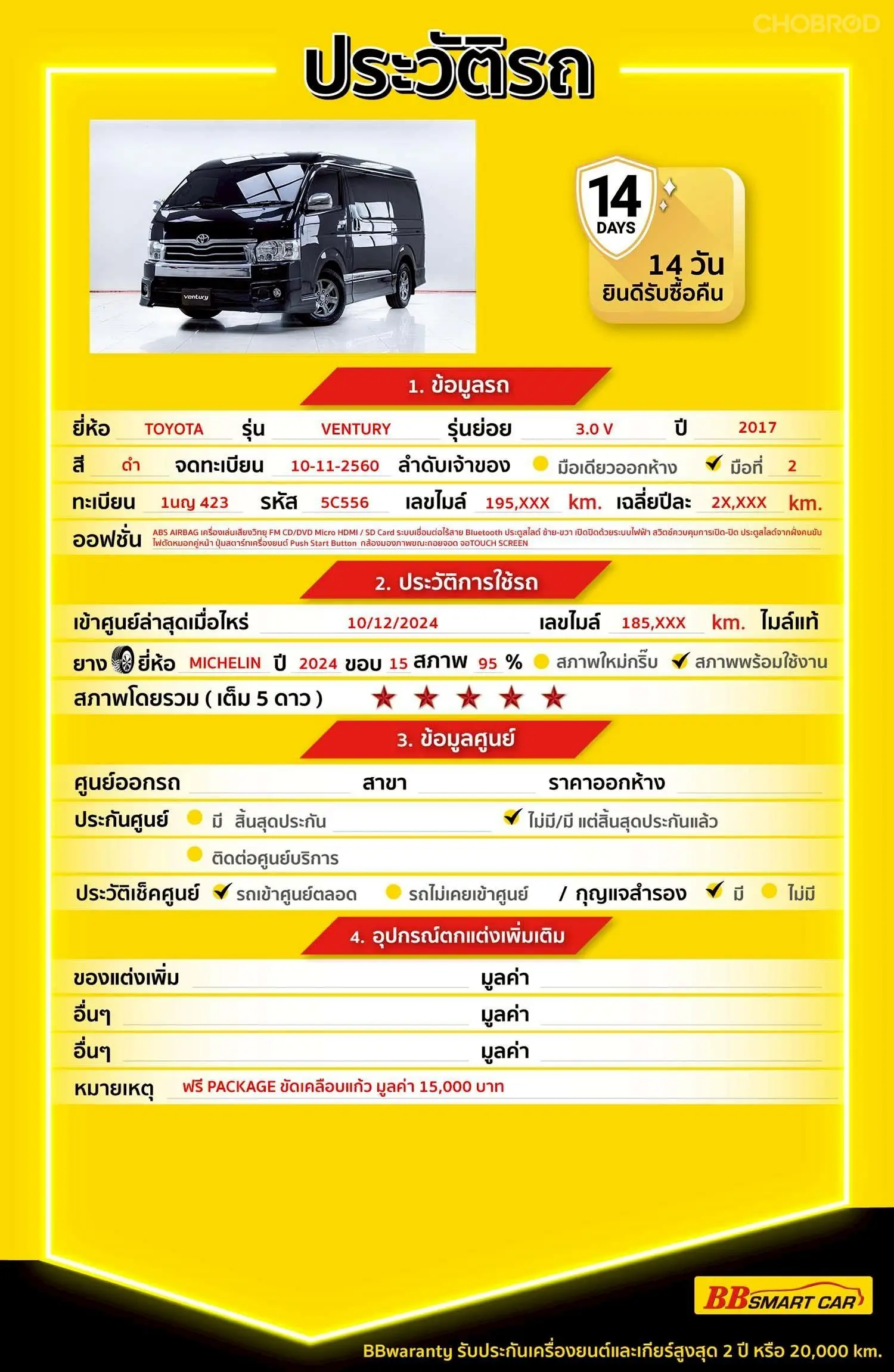 มีการรับประกันจากดีลเลอร์ (6 เดือน) มีบริการช่วยเหลือฉุกเฉินบนท้องถนน 24 ชม. จากดีลเลอร์