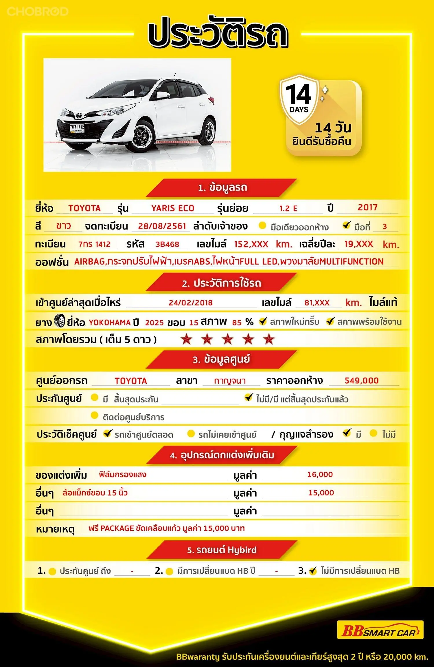 มีการรับประกันจากดีลเลอร์ (6 เดือน) มีบริการช่วยเหลือฉุกเฉินบนท้องถนน 24 ชม. จากดีลเลอร์