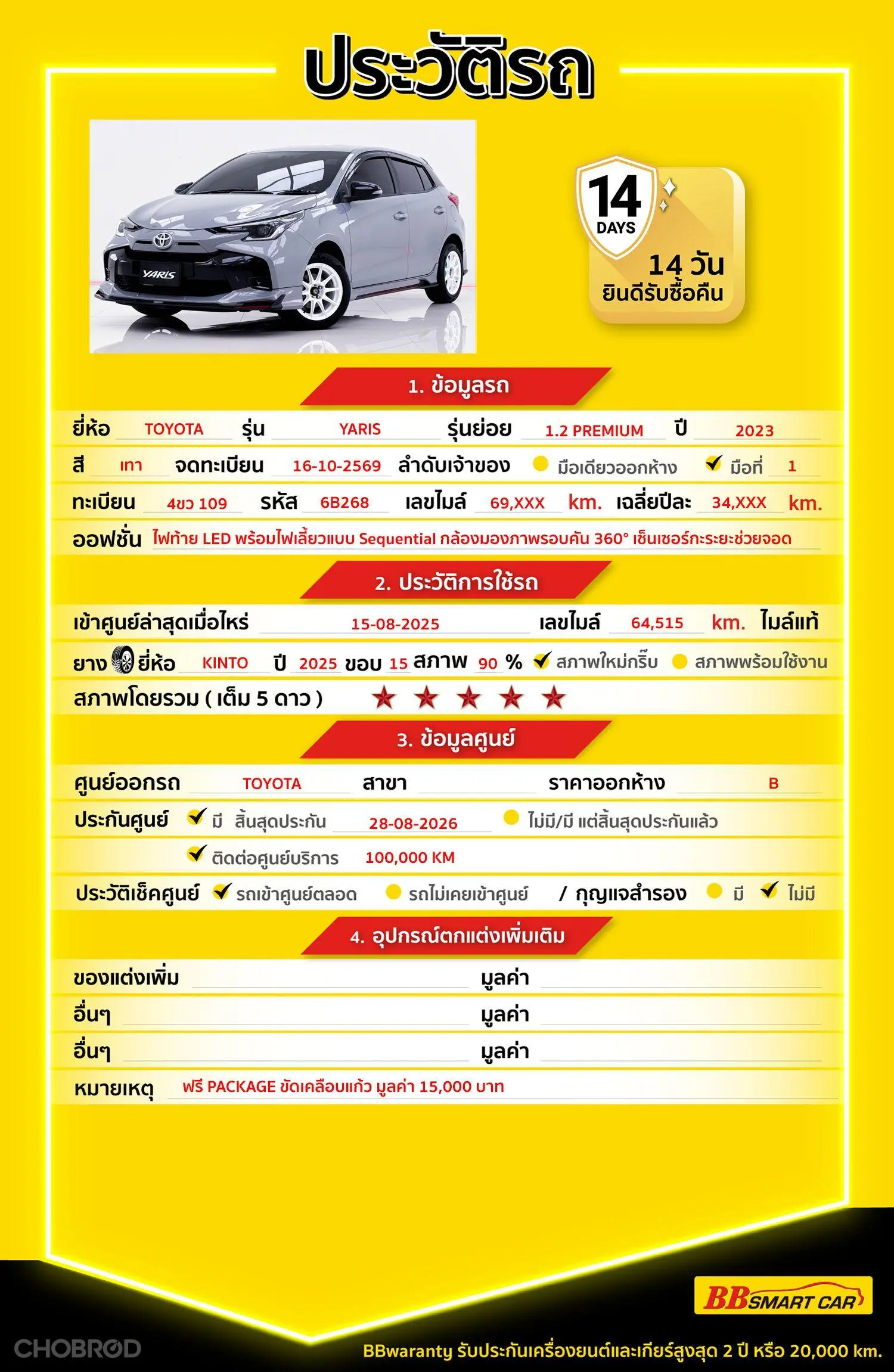 TOYOTA YARIS ECO 1.2 PREMIUM 2023 ออกรถ 0 บาท จัดได้ 479,000 บ. Line:@*******แสดงข้อมูล 🔥จอง 199 บาท ส่งบัตรประชาชน รู้ผลพิจารณาภายใน 30 นาที ไม่ผ่านคืนเงินจองทุกกรณี 🔥ซื้อรถกับ BB พร้อมให้คำปรึกษา แก้ทุกปัญหา ให้ทุกเรื่อง บริการ call center 24 ชม. 🔥BB Care Plus รับประกันหลังการขาย สูงสุด 2 ปี หรือ 20,000 km.. 🔥มีรถให้เลือกมากกว่า 1,800 คัน สาขา 6 ศูนย์รวมรถยนต์ไอคาร์สยาม กาญจนาภิเษก รหัสรถ 6B268 ราคา 459,000 บาท ผ่อนเพียง 7,935 บาท Brand. : TOYOTA Year. : 2023 Model. : YARIS Grade. : 1.2 PREMIUM Engine. : 1,200 CC Type. : เบนซิน Gearbox : AT Color. : เทา Mileage. : 69,xxx KM. (ซื้อสด ราคานี้ยังไม่รวมค่าดำเนินการ 10,000 บ.) 🚩 Price. 459,000 บาท ยอดจัด : 469,000 บาท เงินดาวน์ : 0 บาท ประกันภัย : ฟรีประกันภัย 1 ปี ค่าดำเนินการ : 10,000 บาท รวมออกรถ : 0 บาท ผ่อน 36 = 14,633 บาท ผ่อน 48 = 11,112 บาท ผ่อน 60 = 9,759 บาท ผ่อน 72 = 8,730 บาท ผ่อน 84 = 7,935 บาท เงื่อนไขเป็นไปตามที่ไฟแนนซ์กำหนด โปรโมชั่นพิเศษ สำหรับลูกค้าเครดิตดี 🚩เลือกรับเรทดอกเบี้ยพิเศษ 📍36 งวด = 1.29 % 📍48 งวด = 1.99 % 📍60 งวด = 2.39 % 📍72 งวด = 3.59 % 🔥 เงื่อนไข โปรโมชั่น ดอกเบี้ยเริ่มต้น 1.29% ตลอดอายุสัญญา - ยอดจัดไฟแนนซ์ 300,000-600,0000 บาท - ผ่อนสูงสุด 72 เดือน - เป็นลูกค้าประวัติดี พนักงานประจำเงินเดือน 20,000 ขึ้นไป - ค่าดำเนินการแคมเปญ 20,000 บาท (รวมในยอดจัดได้) 🎗Car Hightlight รถสวยๆ วันนี้ขอแนะนำ TOYOTA YARIS 1.2 PREMIUM AT 2023 ออฟชั่น 12.2.1 : 1. ดีไซน์ใหม่-ภายนอก / ชุดแต่งสไตล์ “Hammerhead” รุ่น Premium ได้ปรับกระจังหน้าเป็นดีไซน์ใหม่เป็นแบบ “Hammerhead” พร้อมกับกันชนหน้า/หลังและดีไซน์ภายนอกที่ให้ลุคดูเฉียบขึ้น มากกว่ารุ่นล่าง ๆ 2. อุปกรณ์ความปลอดภัย (Active Safety) ที่เพิ่มขึ้น มีระบบความปลอดภัยขั้นสูงเพิ่มเติม เช่น Pre-Collision System (ระบบเบรกก่อนการชนอัตโนมัติ), Lane Departure Alert, Rear Cross-Traffic Alert, Blind Spot Monitor เป็นออปชั่นที่ไม่ได้มีในรุ่นล่างทั้งหมด 3. ออปชั่นสะดวกสบายภายใน + ความพรีเมียม รุ่นนี้มีอุปกรณ์เช่น ไฟหน้า LED, ไฟท้าย LED แบบ Sequential, วัสดุตกแต่งภายใน Piano Black, แผงประตูหุ้มวัสดุนุ่ม บุนุ่มที่วางแขน, ช่องแอร์ตกแต่งโครเมียม, Smart Entry + Push Start, หน้าจอสัมผัส รองรับ Apple CarPlay / Android Auto เป็นต้น ซึ่งช่วยยกระดับความรู้สึกการใช้งานและประสบการณ์ภายในรถให้ดีขึ้นมาก 🎗ภายใน พวงมาลัย Multifunction จอ LCD เล่น DVD วิทยุ - CD เซ็นทรัลล๊อก แอร์ เบรค ABS 🎗ภายนอก ไฟเลี้ยวกระจกมองข้าง 🎗ความคุ้มค่า สำหรับคันนี้หากเปรียบเทียบราคากับคุณภาพ คันนี้ถือว่าคุ้มค่ามากค่ะ ผ่อนสบายๆก็มีรถขับได้ รถดีมีคุณภาพแบบนี้รีบตัดสินใจซื้อได้เลราคานี้มาไวไปไวนะคะ ⭐️การรับประกันหลังการขาย BB Care Plus สูงสุด 2 ปี หรือ 20,000 km. ด้วยช่างที่ผ่านการอบรมจากศูนย์ชั้นนำของประเทศ 🎉🎉Special offer เฉพาะ บีบีสมาร์ทคาร์ ที่นี่ที่เดียว ⭐️ ดอกเบี้ยเริ่มต้น 1.29% มีไฟแนนซ์รองรับหลายที่ค่ะ ⭐️ ฟรี!! แพคเก็จ ขัดเคลือบแก้ว มูลค่า 15,000 บาท ทุกคัน ⭐️ อนุม