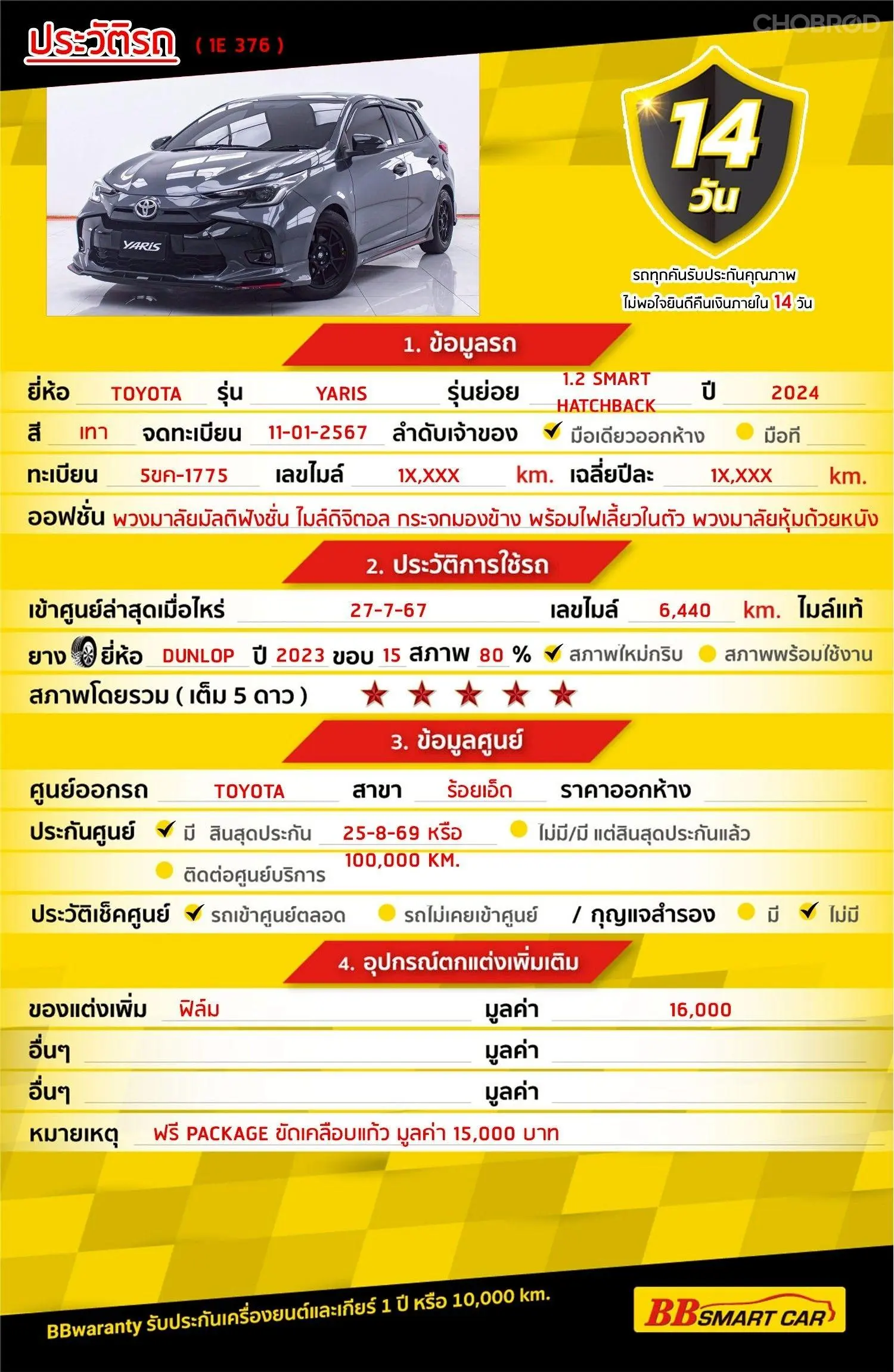 มีการรับประกันจากดีลเลอร์ (6 เดือน) มีบริการช่วยเหลือฉุกเฉินบนท้องถนน 24 ชม. จากดีลเลอร์