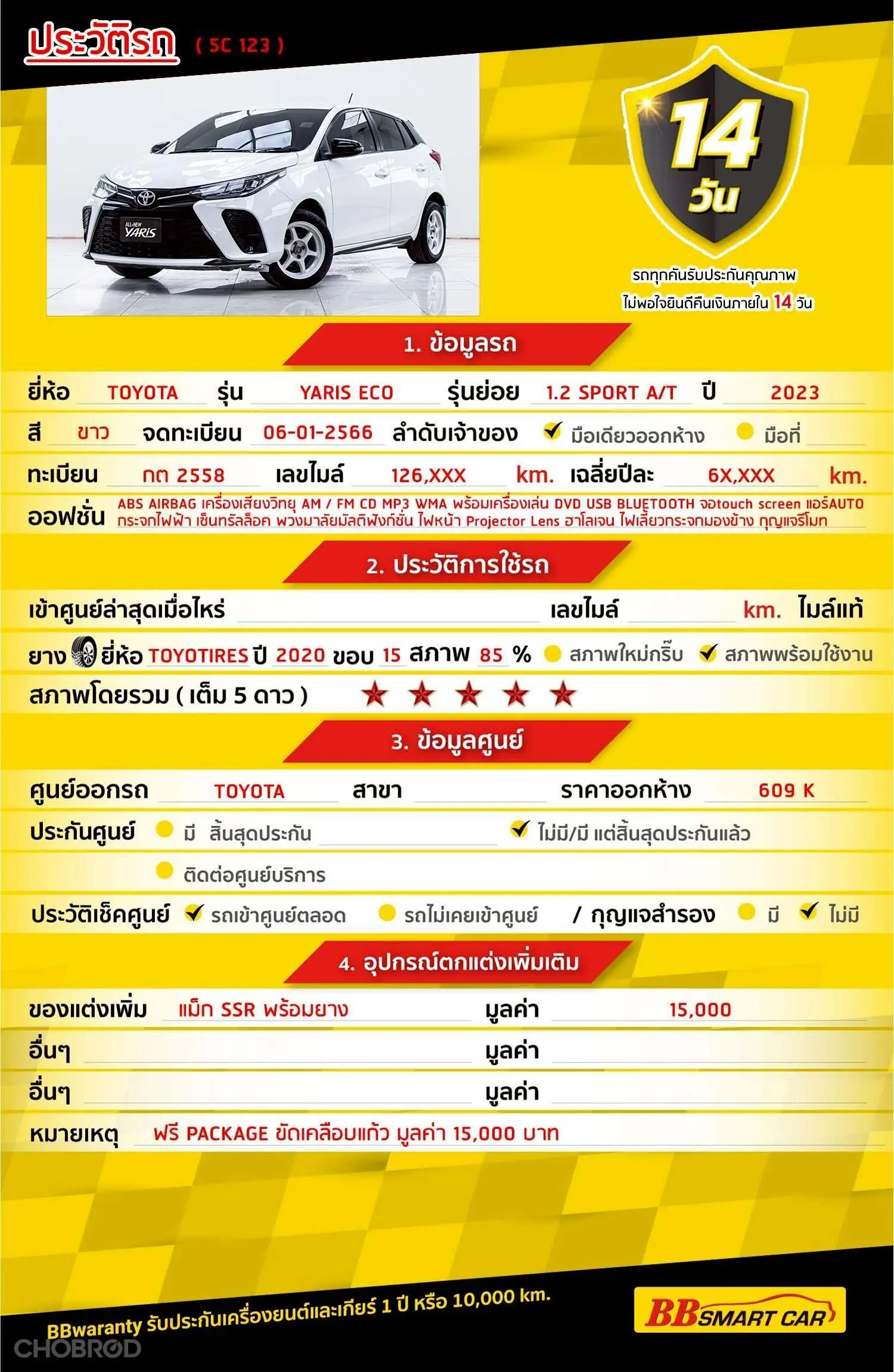TOYOTA YARIS ECO 1.2 SPORT AT 2023 ออกรถ 0 บาท จัดได้ 409,000 บ. Line:@*******แสดงข้อมูล 🔥จอง 199 บาท ส่งบัตรประชาชน รู้ผลพิจารณาภายใน 30 นาที ไม่ผ่านคืนเงินจองทุกกรณี 🔥ซื้อรถกับ BB พร้อมให้คำปรึกษา แก้ทุกปัญหา ให้ทุกเรื่อง บริการ call center 24 ชม. 🔥BB Care Plus รับประกันหลังการขาย สูงสุด 2 ปี หรือ 20,000 km. 🔥มีรถให้เลือกมากกว่า 1,600 คัน บีบีสมาร์ทคาร์ 5 สาขามหาชัย รหัสรถ 5C123 ราคา 389,000 บาท ผ่อนเพียง 6,847 บาท Brand. : TOYOTA Year. : 2023 Model. : YARIS ECO Grade. : 1.2 SPORT Engine. : 1200 CC Type. : เบนซิน Gearbox : A/T Color. : ขาว Mileage. : 126,XXX KM. (ซื้อสด ราคานี้ยังไม่รวมค่าดำเนินการ 10,000 บ.) 🚩 Price. 389,000 บาท ยอดจัด : 399,000 บาท เงินดาวน์ : 0 บาท ประกันภัย : ฟรีประกันภัย 1 ปี ค่าดำเนินการ : 10,000 บาท รวมออกรถ : 0 บาท ผ่อน36 = 13,174 บาท ผ่อน48 = 10,135 บาท ผ่อน60 = 8,421 บาท ผ่อน72 = 7,533 บาท ผ่อน84 = 6,847 บาท เงื่อนไขเป็นไปตามที่ไฟแนนซ์กำหนด** โปรโมชั่นพิเศษ สำหรับลูกค้าเครดิตดี 🚩เลือกรับเรทดอกเบี้ยพิเศษ 📍36 งวด = 1.29 % 📍48 งวด = 1.99 % 📍60 งวด = 2.39 % 📍72 งวด = 3.59 % 🔥เงื่อนไข โปรโมชั่น ดอกเบี้ยเริ่มต้น 1.29% ตลอดอายุสัญญา - ยอดจัดไฟแนนซ์ 300,000-600,0000 บาท - ผ่อนสูงสุด 72 เดือน - เป็นลูกค้าประวัติดี พนักงานประจำเงินเดือน 20,000 ขึ้นไป - ค่าดำเนินการแคมเปญ 20,000 บาท (รวมในยอดจัดได้) 🎗Car Hightlight รถสวยๆ วันนี้ขอแนะนำ TOYOTA YARIS ECO 1.2 SPORT 2023 AT เบนซิน 1 : พวงมาลัย Multifunction 2 : เบาะหนัง 3 : กระจกมองข้างปรับไฟฟ้า 🎗ภายใน วิทยุ - CD กระจกไฟฟ้า พวงมาลัย Multifunction กระจกมองข้างปรับไฟฟ้า แอร์ AUTO เบาะหนัง เบรค ABS จอ LCD เล่น DVD เซ็นทรัลล๊อก Airbag 🎗ภายนอก ตัวรถสีขาว สวยเรียบหรูมาพร้อม ไฟเลี้ยวกระจกมองข้าง กระจกมองข้างพับไฟฟ้า 🎗ความคุ้มค่า สำหรับคันนี้หากเปรียบเทียบราคากับคุณภาพ คันนี้ถือว่าคุ้มค่ามากค่ะ ผ่อนสบายๆก็มีรถขับได้ รถดีมีคุณภาพแบบนี้รีบตัดสินใจซื้อได้เลราคานี้มาไวไปไวนะคะ ⭐️การรับประกันหลังการขาย BB Care Plus สูงสุด 2 ปี หรือ 20,000 km. ด้วยช่างที่ผ่านการอบรมจากศูนย์ชั้นนำของประเทศ 🎉Special offer เฉพาะ บีบีสมาร์ทคาร์ ที่นี่ที่เดียว ⭐ดอกเบี้ยเริ่มต้น 1.29% มีไฟแนนซ์รองรับหลายที่ค่ะ ⭐ฟรี!! แพคเก็จ ขัดเคลือบแก้ว มูลค่า 15,000 บาท ทุกคัน ⭐อนุมัติไว 30 นาที นำเอกสารมาให้ครบรับรถกลับบ้านทันทีค่ะ ⭐BB Care Plus รับประกันหลังการขาย สูงสุด 2 ปี หรือ 20,000 km. ⭐มี 6 สาขา ในกรุงเทพและปริมณฑลใกล้บ้านท่าน ⭐รถทุกคันผ่านตรวจสอบ Inspection เรียบแล้วค่ะ ผ่าน 5 ดาวทุกคันค่ะ ⭐เซลล์ทุกท่านเป็นมืออาชีพพร้อมให้บริการทุกท่านแน่นอนค่ะ