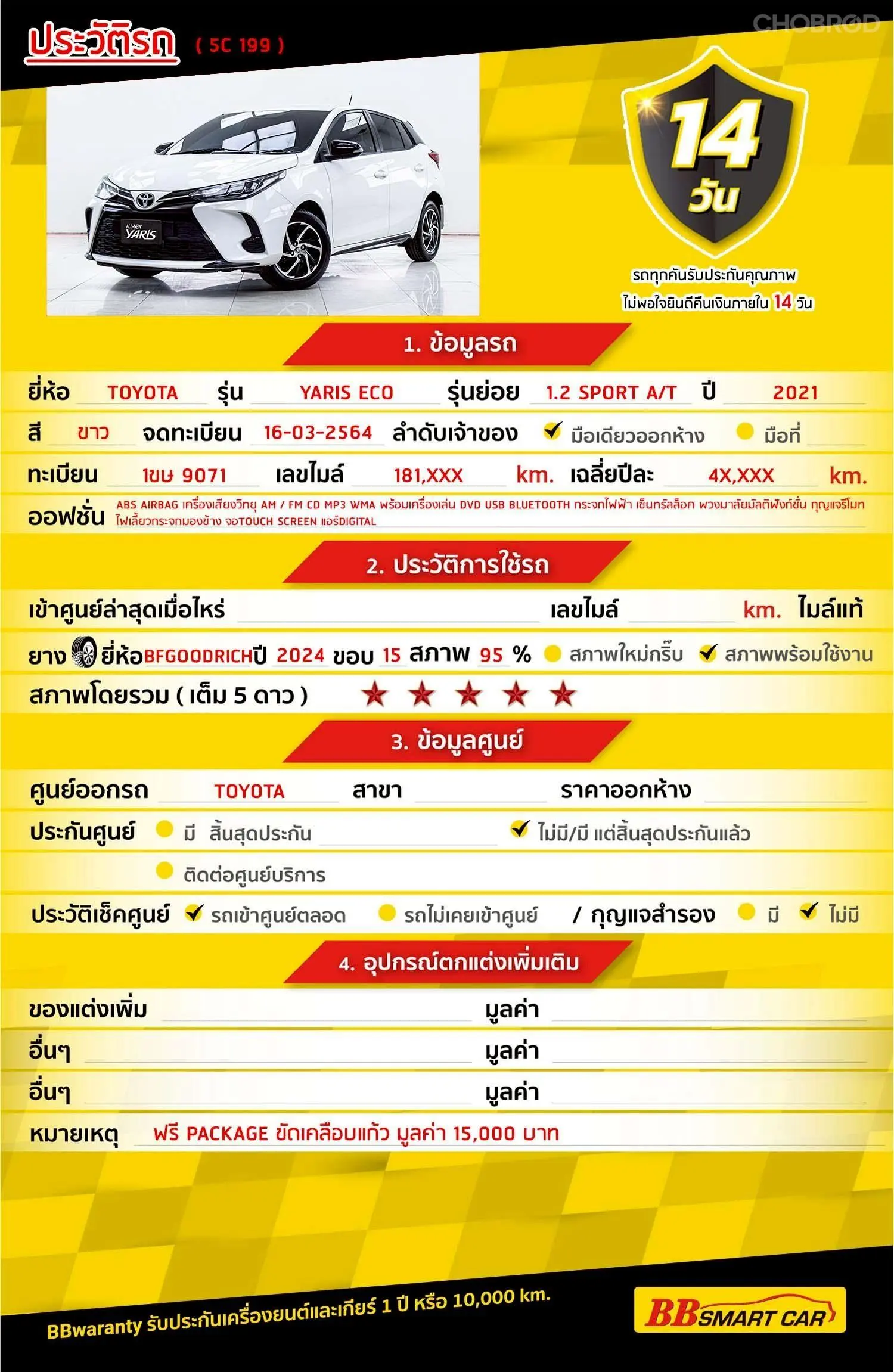 TOYOTA YARIS ECO 1.2 SPORT AT 2021 ออกรถ 0 บาท จัดได้ 409,000 บ. Line:@BBCAR05 🔥จอง 199 บาท ส่งบัตรประชาชน รู้ผลพิจารณาภายใน 30 นาที ไม่ผ่านคืนเงินจองทุกกรณี 🔥ซื้อรถกับ BB พร้อมให้คำปรึกษา แก้ทุกปัญหา ให้ทุกเรื่อง บริการ call center 24 ชม. 🔥BB Care Plus รับประกันหลังการขาย สูงสุด 2 ปี หรือ 20,000 km. 🔥มีรถให้เลือกมากกว่า 1,800 คัน บีบีสมาร์ทคาร์ 5 สาขามหาชัย รหัสรถ 5C199 ราคา 389,000 บาท ผ่อนเพียง 6,680 บาท Brand. : TOYOTA Year. : 2021 Model. : YARIS ECO Grade. : 1.2 SPORT Engine. : 1200 CC Type. : เบนซิน Gearbox : A/T Color. : ขาว Mileage. : 181,XXX KM. (ซื้อสด ราคานี้ยังไม่รวมค่าดำเนินการ 10,000 บ.) 🚩 Price. 389,000 บาท ยอดจัด : 399,000 บาท เงินดาวน์ : 0 บาท ประกันภัย : ฟรีประกันภัย 1 ปี ค่าดำเนินการ : 10,000 บาท รวมออกรถ : 0 บาท ผ่อน36 = 12,852 บาท ผ่อน48 = 9,887 บาท ผ่อน60 = 8,214 บาท ผ่อน72 = 7,349 บาท ผ่อน84 = 6,680 บาท เงื่อนไขเป็นไปตามที่ไฟแนนซ์กำหนด** โปรโมชั่นพิเศษ สำหรับลูกค้าเครดิตดี 🚩เลือกรับเรทดอกเบี้ยพิเศษ 📍36 งวด = 1.29 % 📍48 งวด = 1.99 % 📍60 งวด = 2.39 % 📍72 งวด = 3.59 % 🔥เงื่อนไข โปรโมชั่น ดอกเบี้ยเริ่มต้น 1.29% ตลอดอายุสัญญา - ยอดจัดไฟแนนซ์ 300,000-600,0000 บาท - ผ่อนสูงสุด 72 เดือน - เป็นลูกค้าประวัติดี พนักงานประจำเงินเดือน 20,000 ขึ้นไป - ค่าดำเนินการแคมเปญ 20,000 บาท (รวมในยอดจัดได้) 🎗Car Hightlight รถสวยๆ วันนี้ขอแนะนำ TOYOTA YARIS ECO 1.2 SPORT 2021 เบนซิน 1 : พวงมาลัย Multifunction 2 :ไมล์ Digital 3 : กระจกมองข้างปรับไฟฟ้า 🎗ภายใน Airbag แอร์ AUTO กุญแจรีโมท-สัญญานกันขโมย เบรค ABS พวงมาลัย Multifunction จอ LCD เล่น DVD เบาะหนัง ไมล์ Digital กระจกไฟฟ้า วิทยุ - CD เซ็นทรัลล๊อก 🎗ภายนอก ตัวรถสีเทา สวยเรียบหรูมาพร้อม กระจกมองข้างปรับไฟฟ้า ไฟเลี้ยวกระจกมองข้าง กระจกมองข้างพับไฟฟ้า 🎗ความคุ้มค่า สำหรับคันนี้หากเปรียบเทียบราคากับคุณภาพ คันนี้ถือว่าคุ้มค่ามากค่ะ ผ่อนสบายๆก็มีรถขับได้ รถดีมีคุณภาพแบบนี้รีบตัดสินใจซื้อได้เลราคานี้มาไวไปไวนะคะ ⭐️การรับประกันหลังการขาย BB Care Plus สูงสุด 2 ปี หรือ 20,000 km. ด้วยช่างที่ผ่านการอบรมจากศูนย์ชั้นนำของประเทศ 🎉Special offer เฉพาะ บีบีสมาร์ทคาร์ ที่นี่ที่เดียว ⭐ดอกเบี้ยเริ่มต้น 1.29% มีไฟแนนซ์รองรับหลายที่ค่ะ ⭐ฟรี!! แพคเก็จ ขัดเคลือบแก้ว มูลค่า 15,000 บาท ทุกคัน ⭐อนุมัติไว 30 นาที นำเอกสารมาให้ครบรับรถกลับบ้านทันทีค่ะ ⭐BB Care Plus รับประกันหลังการขาย สูงสุด 2 ปี หรือ 20,000 km. ⭐มี 6 สาขา ในกรุงเทพและปริมณฑลใกล้บ้านท่าน ⭐รถทุกคันผ่านตรวจสอบ Inspection เรียบแล้วค่ะ ผ่าน 5 ดาวทุกคันค่ะ ⭐เซลล์ทุกท่านเป็นมืออาชีพพร้อมให้บริการทุกท่านแน่นอนค่ะ