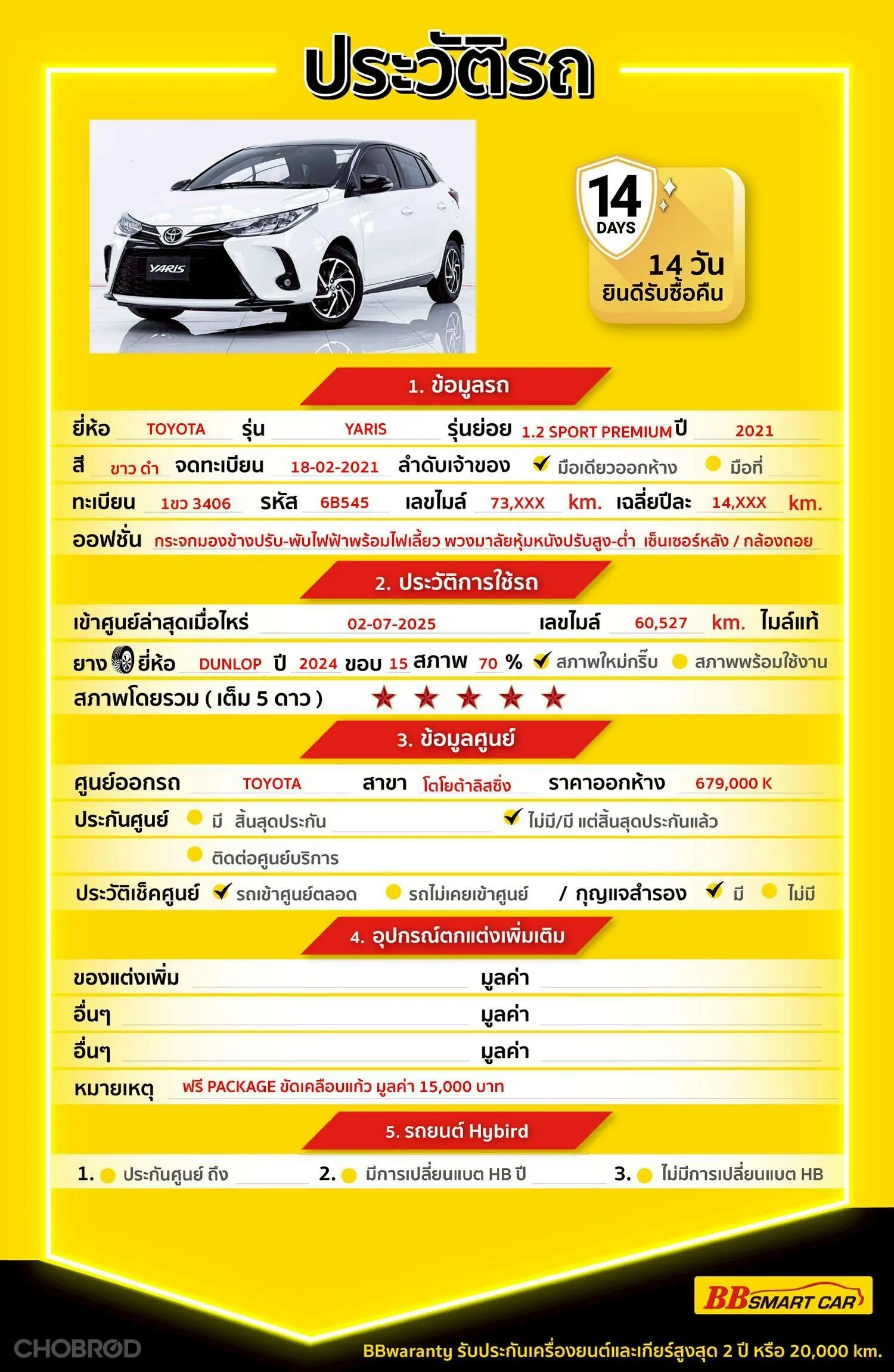 TOYOTA YARIS 1.2 SPORT PREMIUM AT 2021 ออกรถ 0 บาท รหัส 6B545 Line: ID @*******แสดงข้อมูล 🔥มีรถให้เลือกมากกว่า 1,800 คัน 🔥รถทุกคันผ่านตรวจสอบ Inspection เรียบแล้วค่ะ ผ่าน 5 ดาวทุกคันค่ะ 🔥ซื้อรถกับ BB พร้อมให้คำปรึกษา แก้ทุกปัญหา ให้ทุกเรื่อง บริการ call center 24 ชม. 🔥BB Care Plus รับประกันหลังการขาย สูงสุด 2 ปี หรือ 20,000 km. 🔥ฟรี!! แพคเก็จ ขัดเคลือบแก้ว มูลค่า 15,000 บาท ทุกคัน 🔥มี 6 สาขา ในกรุงเทพและปริมณฑลใกล้บ้านท่าน สาขา 6 ศูนย์รวมรถยนต์ไอคาร์สยาม กาญจนาภิเษก รหัสรถ 6B545 ราคา 399,000 บาท ผ่อนเพียง 6,847 บาท Brand. : TOYOTA Year. : 2021 Model. : YARIS Grade. : 1.2 SPORT PREMIUM Engine. : 1,200 CC Type. : เบนซิน Gearbox : AT Color. :ขาว Mileage. : 73,XXX KM. (ซื้อสด ราคานี้ยังไม่รวมค่าดำเนินการ 10,000 บ.) 🚩 Price. 399,000 บาท ยอดจัด : 409,000 บาท เงินดาวน์ : 0 บาท ประกันภัย : ฟรีประกันภัย 1 ปี ค่าดำเนินการ : 10,000 บาท รวมออกรถ : 0 บาท ผ่อน 36 งวด = 13,174 บาท ผ่อน 48 งวด = 10,135 บาท ผ่อน 60 งวด = 8,421 บาท ผ่อน 72 งวด = 7,533 บาท ผ่อน 84 งวด = 6,847 บาท เงื่อนไขเป็นไปตามที่ไฟแนนซ์กำหนด โปรโมชั่นพิเศษ สำหรับลูกค้าเครดิตดีลือกรับเรทดอกเบี้ยพิเศษ 📍36 งวด = 1.29 % 📍48 งวด = 1.99 % 📍60 งวด = 2.39 % 📍72 งวด = 3.59 % 🔥 เงื่อนไข โปรโมชั่น ดอกเบี้ยเริ่มต้น 1.29% ตลอดอายุสัญญา - ยอดจัดไฟแนนซ์ 300,000-600,000 บาท - ผ่อนสูงสุด 72 เดือน - เป็นลูกค้าประวัติดี พนักงานประจำเงินเดือน 20,000 ขึ้นไป - ค่าดำเนินการแคมเปญ 20,000 บาท (รวมในยอดจัดได้) 🎗Car Hightlight รถสวยๆ วันนี้ขอแนะนำ TOYOTA YARIS 1.2 SPORT PREMIUM AT 2021 จุดเด่นออฟชั่น 12.2.1 : 1. ครบออปชั่นทั้งภายนอกและภายในท็อปสุดสำหรับรุ่นนี้ • ไฟหน้าโปรเจคเตอร์ / LED พร้อมไฟ Daytime Running Lights (DRL) และไฟท้าย LED • สเกิร์ตรอบคัน และล้อแม็กดีไซน์สปอร์ต • พวงมาลัยหุ้มหนัง ปรับสูง-ต่ำได้ • เบาะนั่งคนขับปรับสูง-ต่ำได้ และเบาะหุ้มเนื้อดี • ระบบเครื่องเสียง พร้อมจอ, Bluetooth/USB และฟังก์ชันเชื่อมต่อมือถือ • Push Start / Smart Entry keyless entry เครื่องยนต์ 1.2 ลิตร พร้อมเกียร์ CVT ใหม่นุ่ม ประหยัดน้ำมัน 🎗ภายใน • Push Start & Smart Entry • พวงมาลัยหุ้มหนังปรับสูง-ต่ำ • เบาะปรับสูง-ต่ำสำหรับคนขับ • หน้าจอ Infotainment พร้อม Bluetooth/USB • ระบบแอร์อัตโนมัติ • ช่องเสียบไฟ 12V 🎗ภายนอก • ไฟหน้าโปรเจคเตอร์ LED + DRL • ไฟท้าย LED • กระจกมองข้างปรับ-พับไฟฟ้าพร้อมไฟเลี้ยว • ล้อแม็กขนาดประมาณ 15″ • สเกิร์ตรอบคัน • สปอยเลอร์หลัง