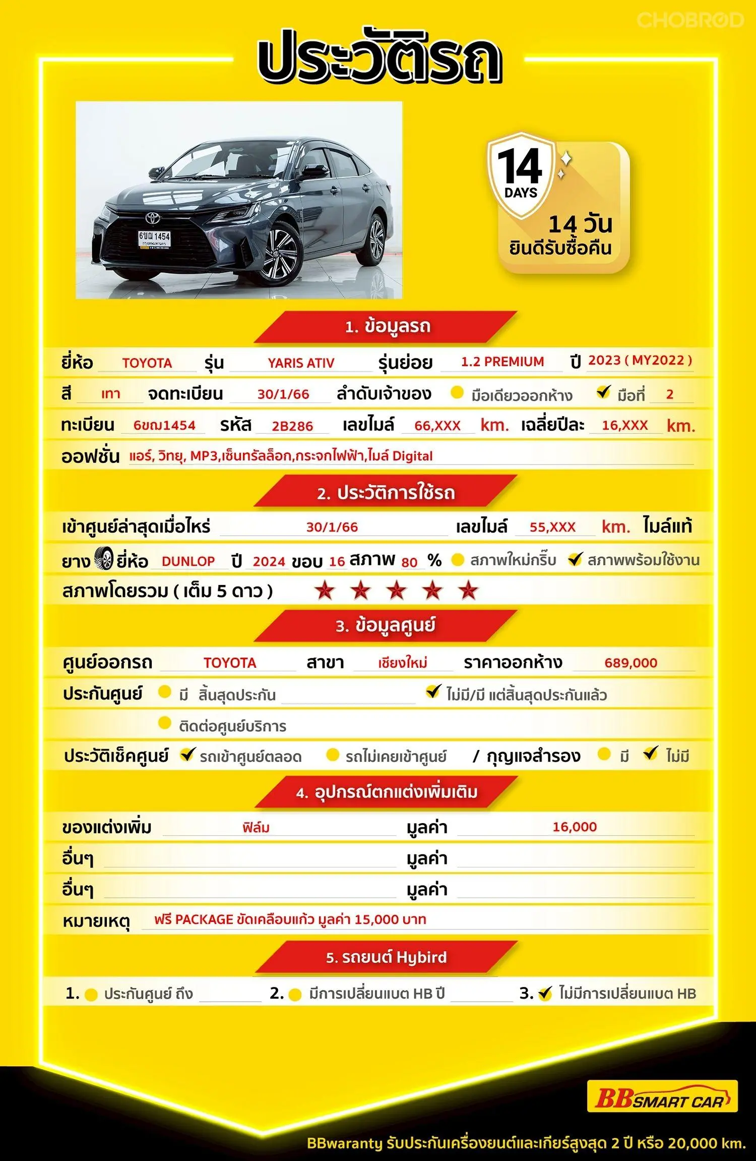 มีการรับประกันจากดีลเลอร์ (6 เดือน) มีบริการช่วยเหลือฉุกเฉินบนท้องถนน 24 ชม. จากดีลเลอร์