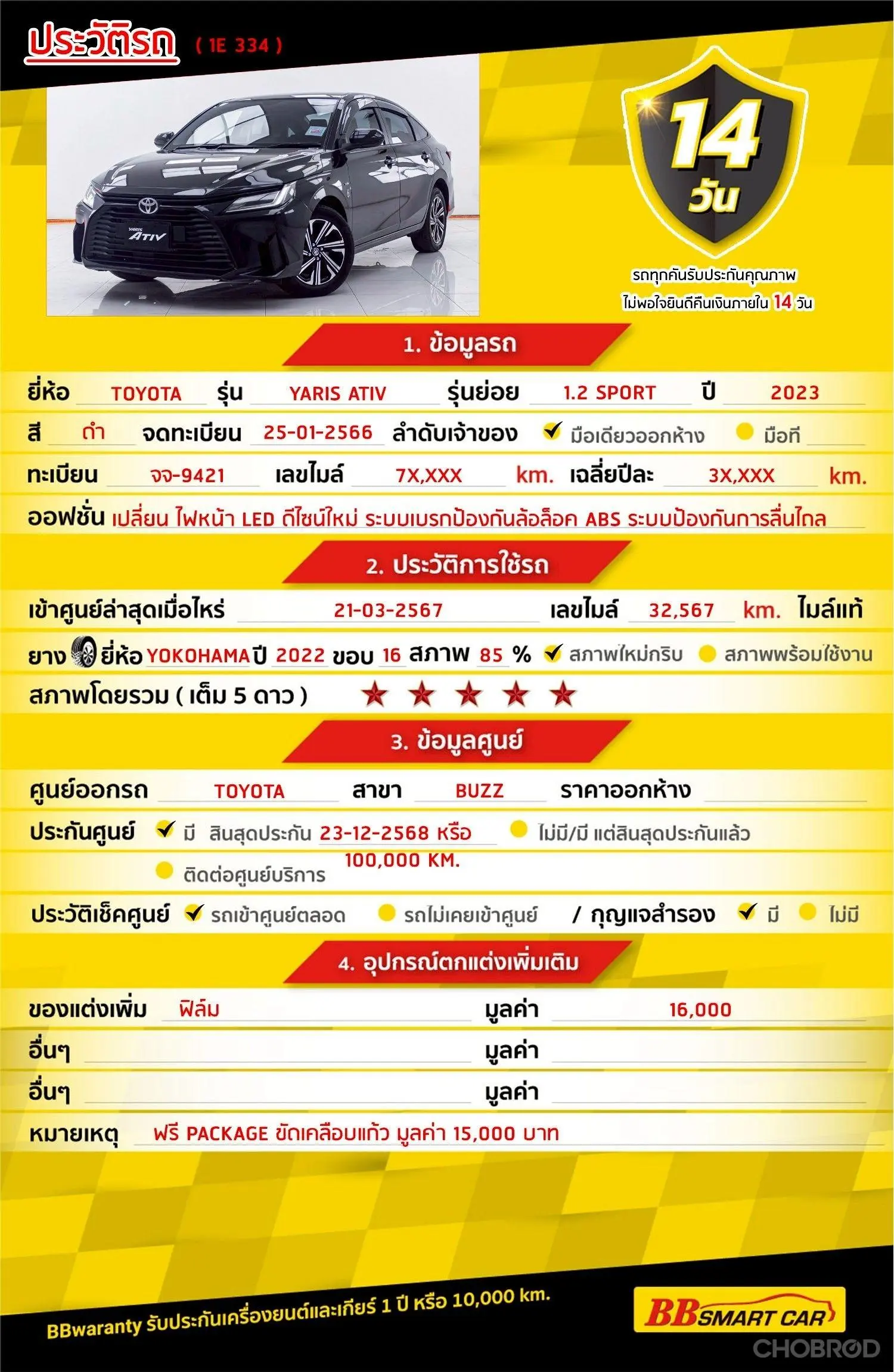 TOYOTA YARIS ATIV 1.2 SPORT AT 2023 ออกรถ 0 บาท จัดได้429,000 Line:@**********แสดงข้อมูล 🔥จอง 199 บาท ส่งบัตรประชาชน รู้ผลพิจารณาภายใน 30 นาที ไม่ผ่านคืนเงินจองทุกกรณี 🔥ซื้อรถกับ BB พร้อมให้คำปรึกษา แก้ทุกปัญหา ให้ทุกเรื่อง บริการ call center 24 ชม. 🔥BB Care Plus รับประกันหลังการขาย สูงสุด 2 ปี หรือ 20,000 km.. 🔥มีรถให้เลือกมากกว่า 1,800 คัน สาขา 1 สี่แยกมไหสวรรย์ ใกล้เดอะมอลล์ท่าพระ รหัสรถ 1E334 ราคา 409,000 บาท ผ่อนเพียง 7,015 บาท Brand. : TOYOTA Year. : 2023 Model. : YARIS ATIV Grade. : 1.2 SPORT Engine. : 1200 CC Type. : เบนซิน Gearbox : AT Color. : ดำ Mileage. : 74,XXX KM. (ซื้อสด ราคานี้ยังไม่รวมค่าดำเนินการ 10,000 บ.) 🚩 Price. 409,000 บาท ยอดจัด : 419,000 บาท เงินดาวน์ : 0 บาท ประกันภัย : ฟรีประกันภัย 1 ปี ค่าดำเนินการ : 10,000 บาท รวมออกรถ : 0 บาท ผ่อน 36 งวด = 13,496 บาท ผ่อน 48 งวด = 10,382 บาท ผ่อน 60 งวด = 8,626 บาท ผ่อน 72 งวด = 7,718 บาท ผ่อน 84 งวด = 7,015 บาท เงื่อนไขเป็นไปตามที่ไฟแนนซ์กำหนด โปรโมชั่นพิเศษ สำหรับลูกค้าเครดิตดีลือกรับเรทดอกเบี้ยพิเศษ 📍36 งวด = 1.29 % 📍48 งวด = 1.99 % 📍60 งวด = 2.39 % 📍72 งวด = 3.59 % 🔥 เงื่อนไข โปรโมชั่น ดอกเบี้ยเริ่มต้น 1.29% ตลอดอายุสัญญา - ยอดจัดไฟแนนซ์ 300,000-600,000 บาท - ผ่อนสูงสุด 72 เดือน - เป็นลูกค้าประวัติดี พนักงานประจำเงินเดือน 20,000 ขึ้นไป - ค่าดำเนินการแคมเปญ 20,000 บาท (รวมในยอดจัดได้) 🎗Car Hightlight รถสวยๆ วันนี้ขอแนะนำ TOYOTA YARIS ATIV 1.2 SPORT AT 2023 จุดเด่นออฟชั่น 1 : ภายในห้องโดยสาร โทนสีดำ หรือ สีเบจ (แล้วแต่รุ่นย่อย) 2 : เบาะนั่งคนขับปรับด้วยมือ 6 ทิศทาง 3 : เบาะนั่งผู้โดยสารตอนหน้า ปรับด้วยมือ 4 ทิศทาง 🎗ภายใน เพิ่ม ระบบเปิด-ปิดไฟหน้า แบบอัตโนมัติ เพิ่ม ระบบไฟ Follow-me-home เปลี่ยน วัสดุตกแต่งภายในห้องโดยสาร สีเงินเข้ม เพิ่ม ช่องชาร์จไฟ USB 2 ตำแหน่ง สำหรับผู้โดยสารตอนหลัง เพิ่ม ระบบปัดน้ำฝนแบบอัตโนมัติ Rain Sensor เพิ่ม กระจกมองหลังแบบปรับลดแสงอัตโนมัติ เพิ่ม ระบบเตือนก่อนการชน Pre-Collision System เพิ่ม ระบบเตือนเมื่อรถออกนอกเลน Lane Departure Alert อุปกรณ์มาตรฐานด้านระบบช่วยเหลือการขับขี่ และ ระบบความปลอดภัย ที่มีใน Yaris ATIV Minorchange ” ทุกรุ่นย่อย “ ระบบเบรกป้องกันล้อล็อค ABS ระบบกระจายแรงเบรก EBD ระบบเสริมแรงเบรก BA ระบบควบคุมการทรงตัว VSC ระบบป้องกันการลื่นไถล TRC ระบบช่วยออกตัวบนทางลาดชัน HAC ถุงลมนิรภัย 7 ตำแหน่ง (คู่หน้า-ด้านข้าง-ม่านนิรภัย-หัวเข่า) 🎗ภายนอก เปลี่ยน ไฟหน้า LED ดีไซน์ใหม่ เปลี่ยน กระจังหน้า ดีไซน์ใหม่ เปลี่ยน กันชนหน้า ดีไซน์ใหม่ เปลี่ยน ล้ออัลลอย ดีไซน์ใหม่ 🎗ความคุ้มค่า สำหรับคันนี้หากเปรียบเทียบราคากับคุณภาพ คันนี้ถือว่าคุ้มค่ามากค่ะ ผ่อนสบายๆก็มีรถขับได้ รถดีมีคุณภาพแบบนี้รีบตัดสินใจซื้อได้เลราคานี้มาไวไปไวนะคะ ⭐️การรับประกันหลังการขาย BB Care Plus สูงสุด 2 ปี หรือ 20,000 km. ด้วยช่างที่ผ่านการอบรมจากศูนย์ชั้นนำของประเทศ 🎉Special offe